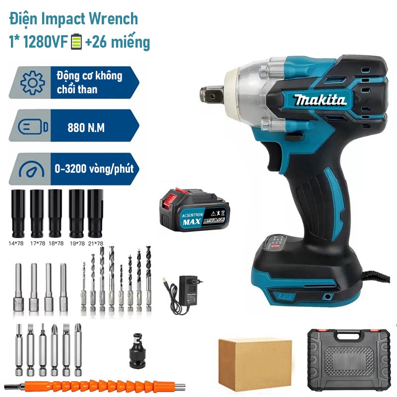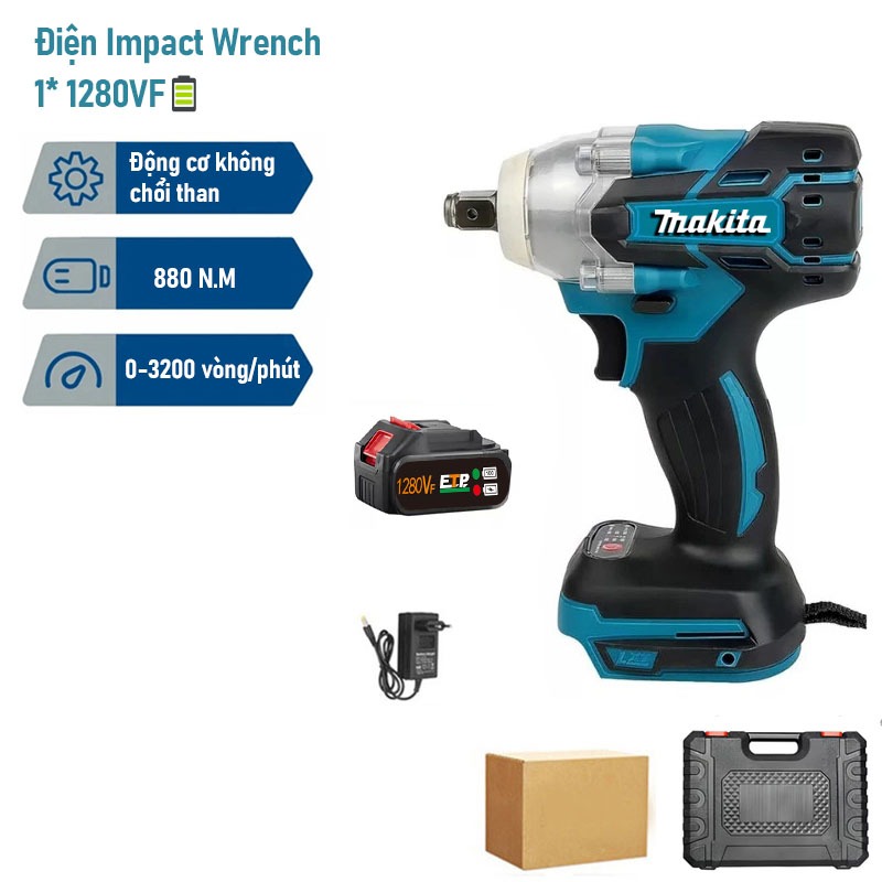 Máy siết bulong pin MAKITA 1280VF , Máy bắn bulong, Lực Siết 380Nm,Động cơ không chổi than Đầu bulong 2 trong 1