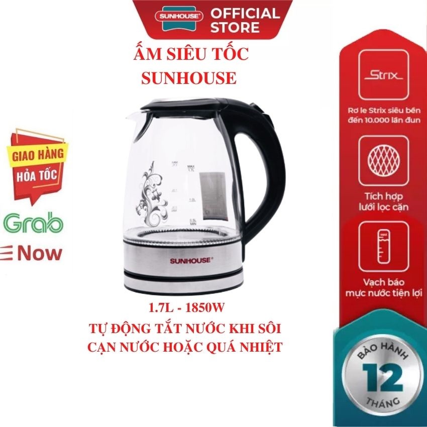 Ấm Đun Siêu Tốc Thuỷ Tinh SUNHOUSE SHD1217 Bình Đun Nước Sôi Tự Ngắt Mới 100% Chính Hãng Bảo Hành Toàn Quốc
