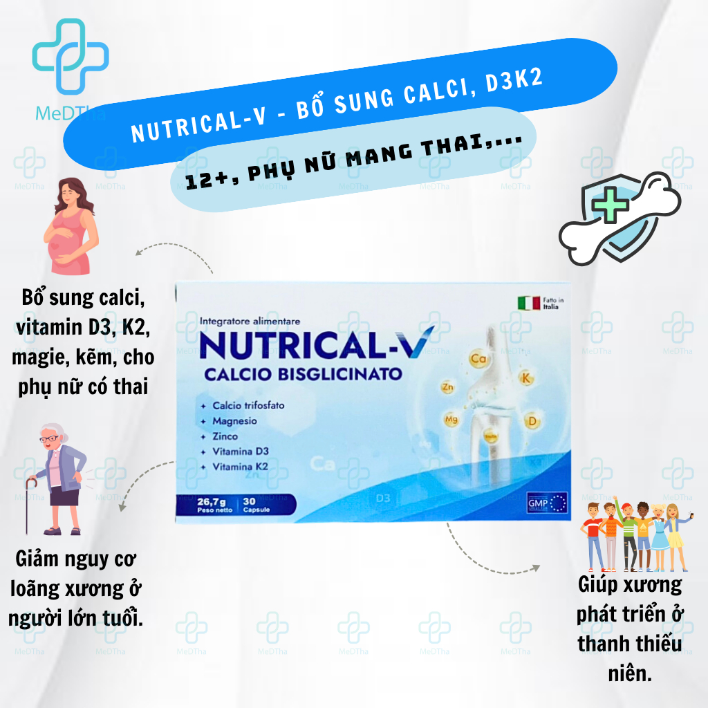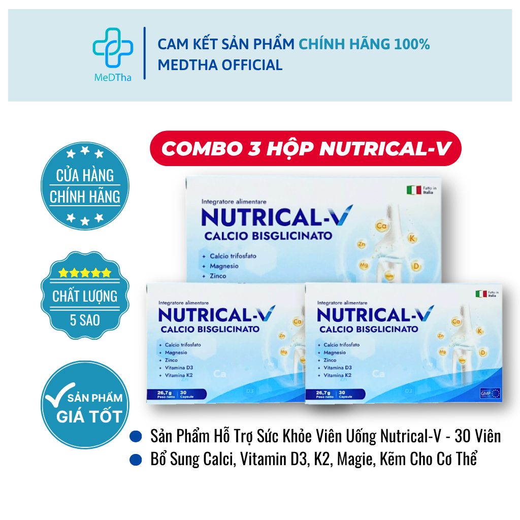 [COMBO 3 HỘP] Nutrical-V - Bổ Sung Canxi, Vitamin D3, K2, Magie, Kẽm Cho Phụ Nữ Có Thai, Cho Con Bú