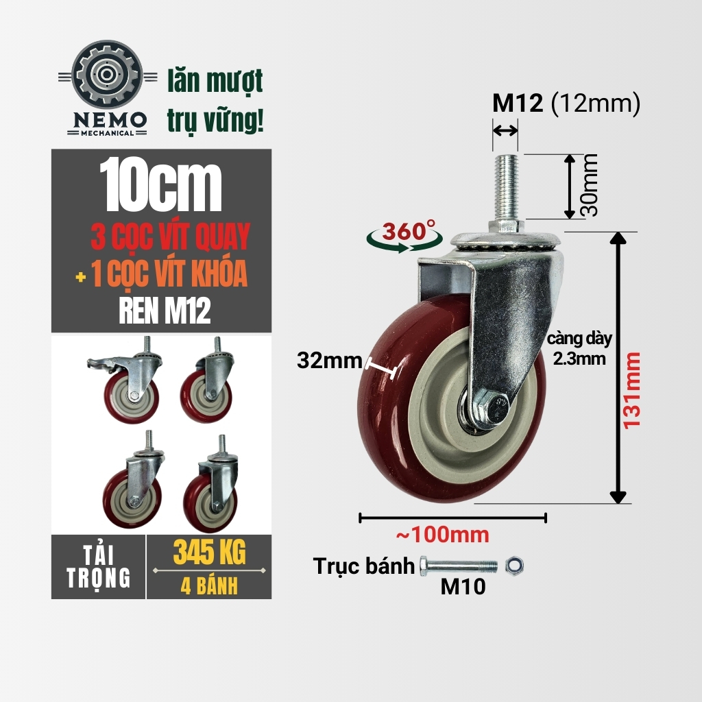 COMBO bánh xe PVC đỏ mận Cọc vít M12, tải trọng trên 300kg cho xe đẩy, quầy bán hàng di đông