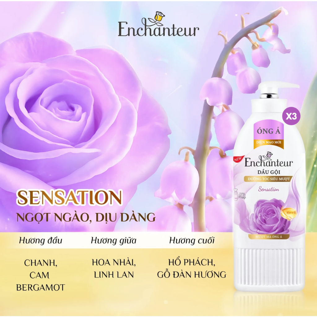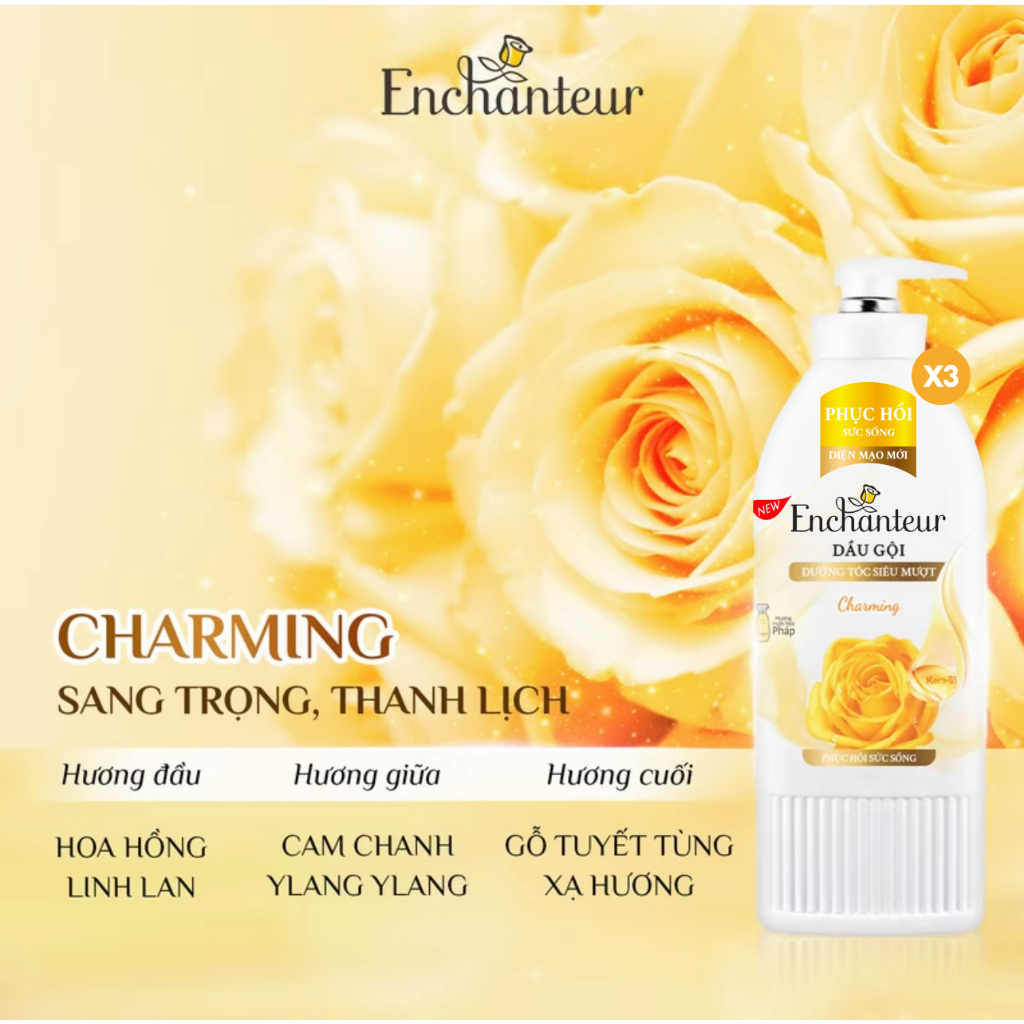 Combo 3 Dầu gội dưỡng tóc siêu mượt thơm Enchanteur Keratin 650g - Charming Phục hồi sức sống/Sensation Mượt mà óng ả