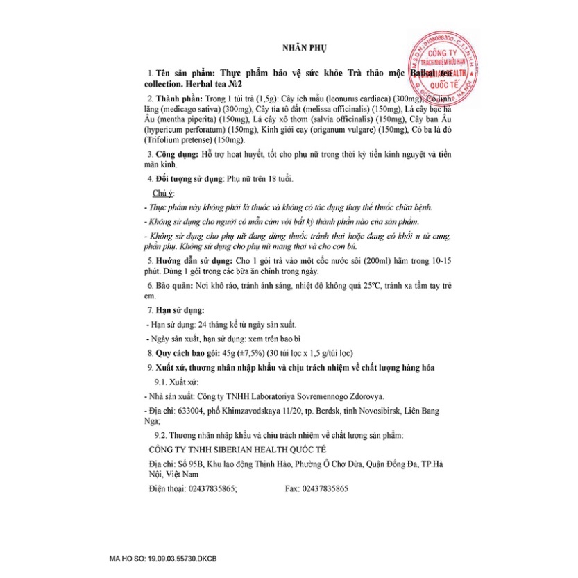 [Trà N2]- Siberian Wellness-Trà thảo mộc Baikal Herbal tea №2 hoạt huyết, tốt cho phụ nữ trong thời kỳ tiền kinh nguyệt