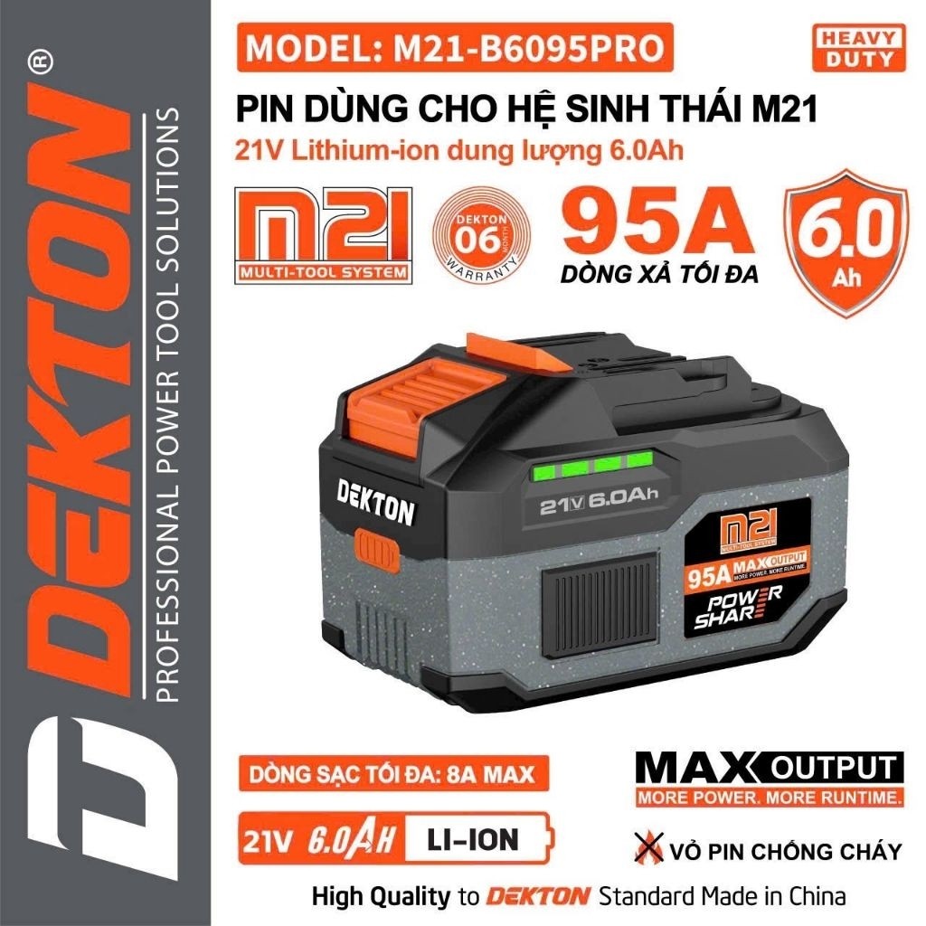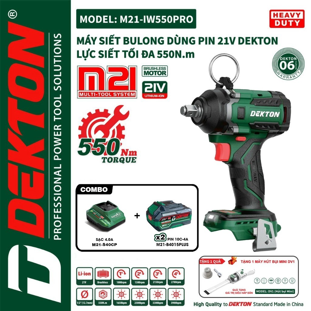 [Tặng DV1] Máy siết bulong pin DEKTON M21-IW550PRO, Không chổi than 550Nm, 4 Tốc độ
