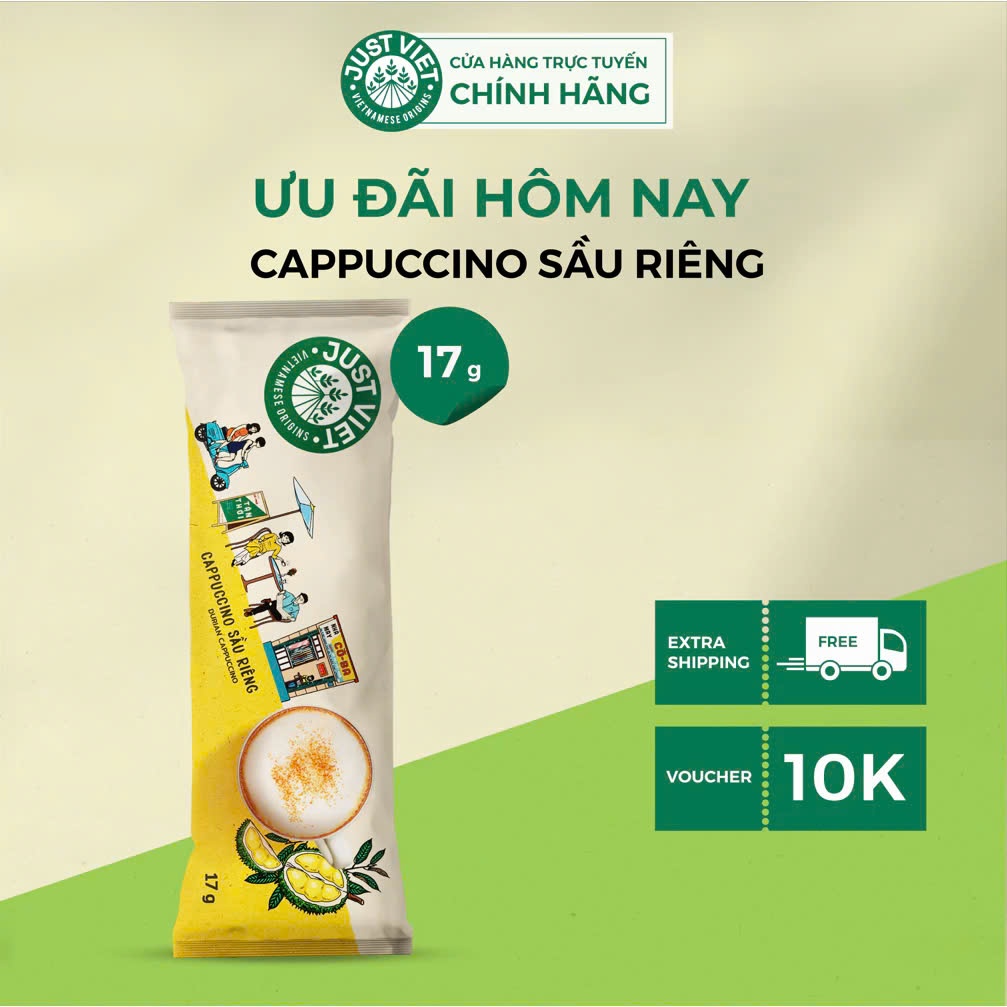 Cà Phê Cappuccino Sầu Riêng Just Viet - Sánh Đậm Tự Nhiên - HỘP 10 GÓI x 17g