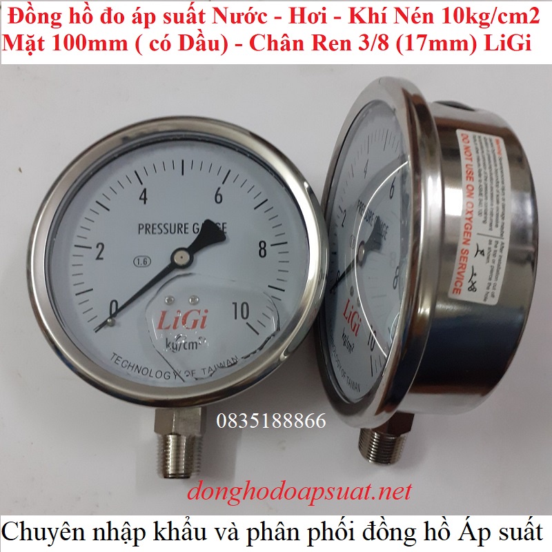 Đồng hồ đo áp suất _ Mặt 100mm _ Chân Ren 3/8 = 17mm _ Loại 10 Bar _ Mặt có Dầu _ Hiệu LIGI Taiwan