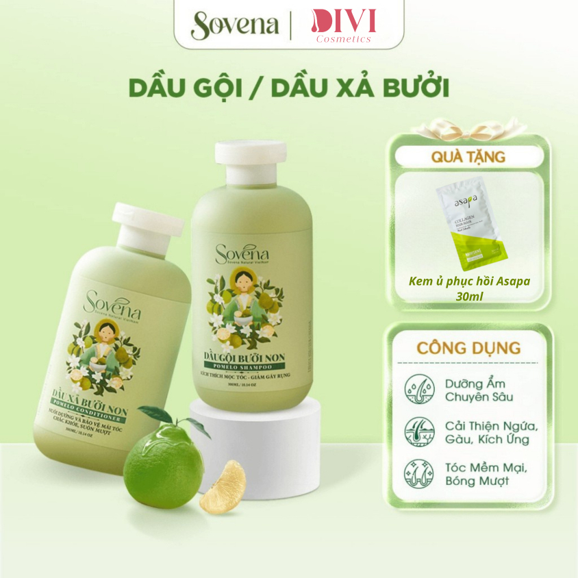 Dầu gội xả thiên nhiên Bưởi Non Sovena - Không silicone/paraben, hỗ trợ mọc tóc, ngăn rụng, 300ml - Mỹ phẩm Divi
