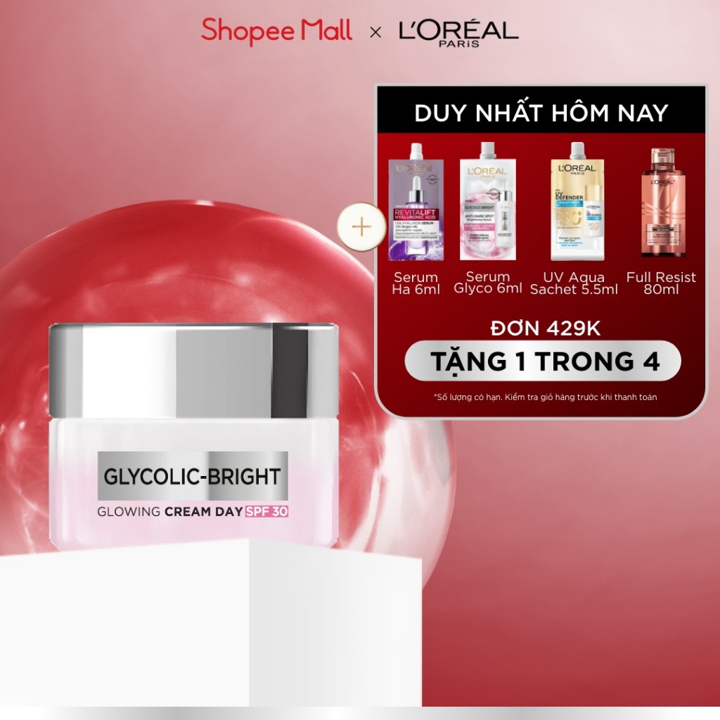Kem dưỡng ban ngày dưỡng sáng mịn & mờ thâm nám L'Oreal Paris Glycolic (AHA) Bright [Glycolic + Niacinamide] SPF 30 50ml