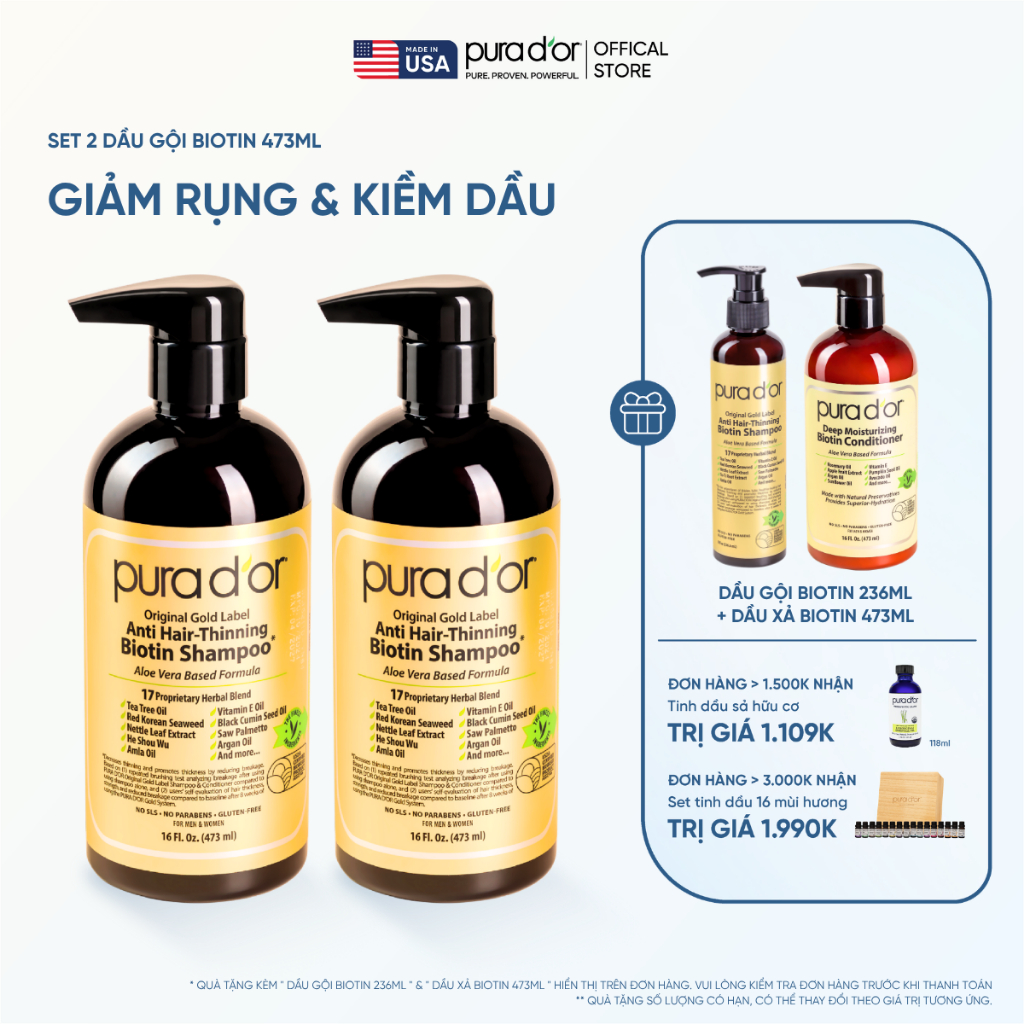 Set 2 Dầu gội hữu cơ hỗ trợ giảm rụng tóc, mọc tóc Biotin Pura D'or Original Gold Label 473ml
