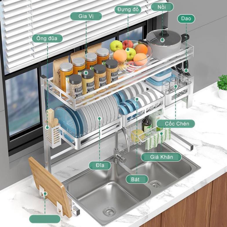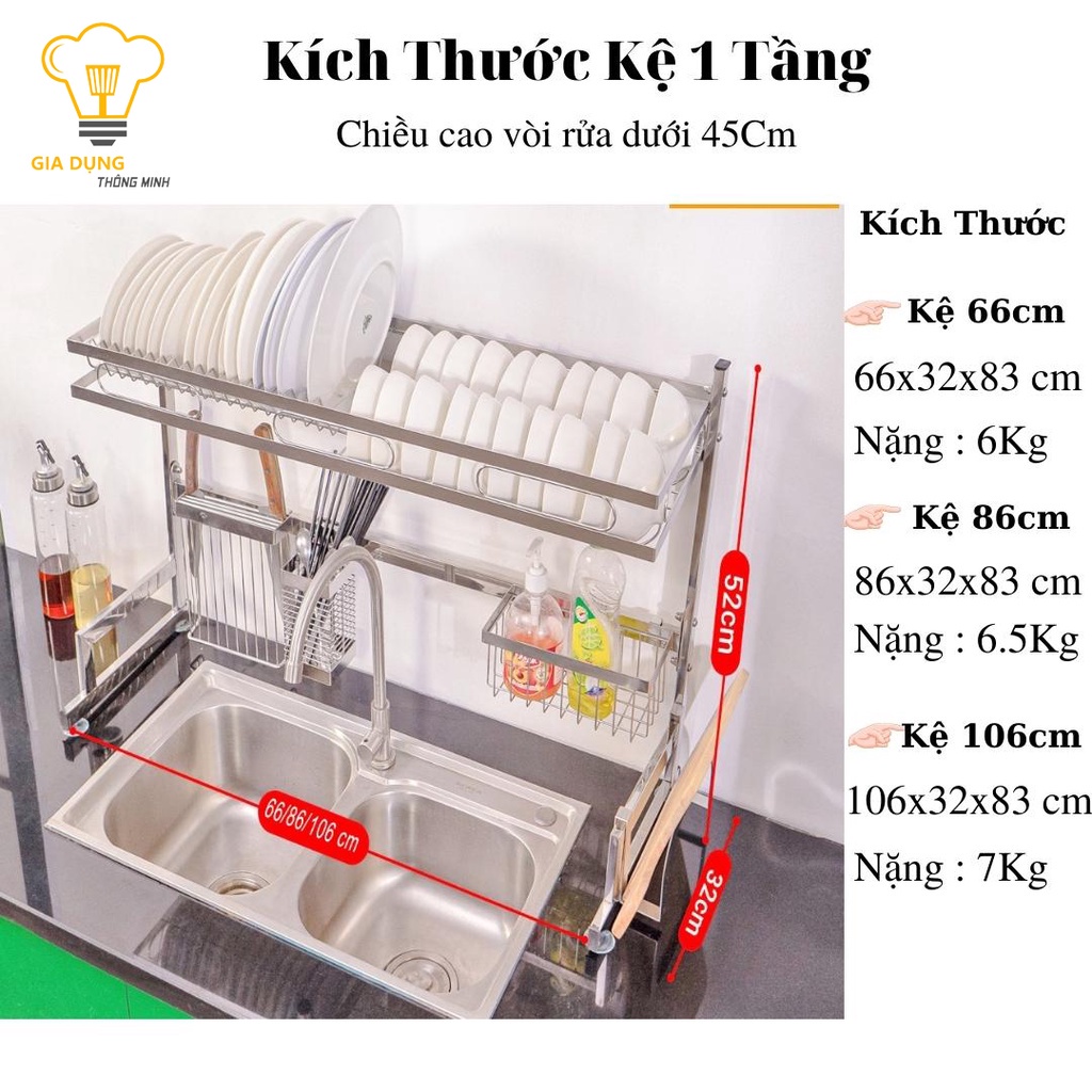 Kệ chén bát thông minh inox 304 1 tầng / 2 tầng, giá đựng bát đĩa kèm các phụ kiện tiện ích