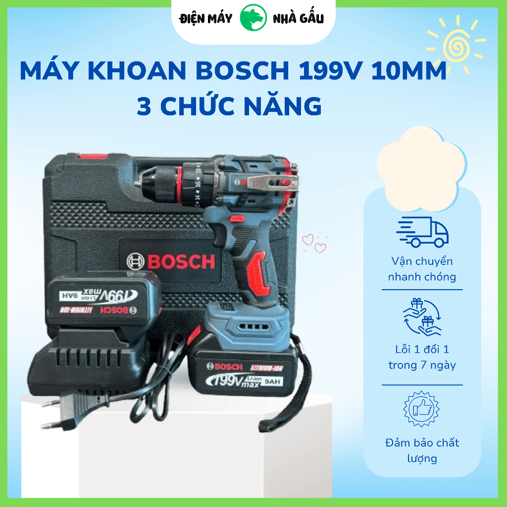 Máy khoan bosch 199v 10mm 3 chức năng có búa đầu auto lock chân pin phổ thông tặng 25 món phụ kiện