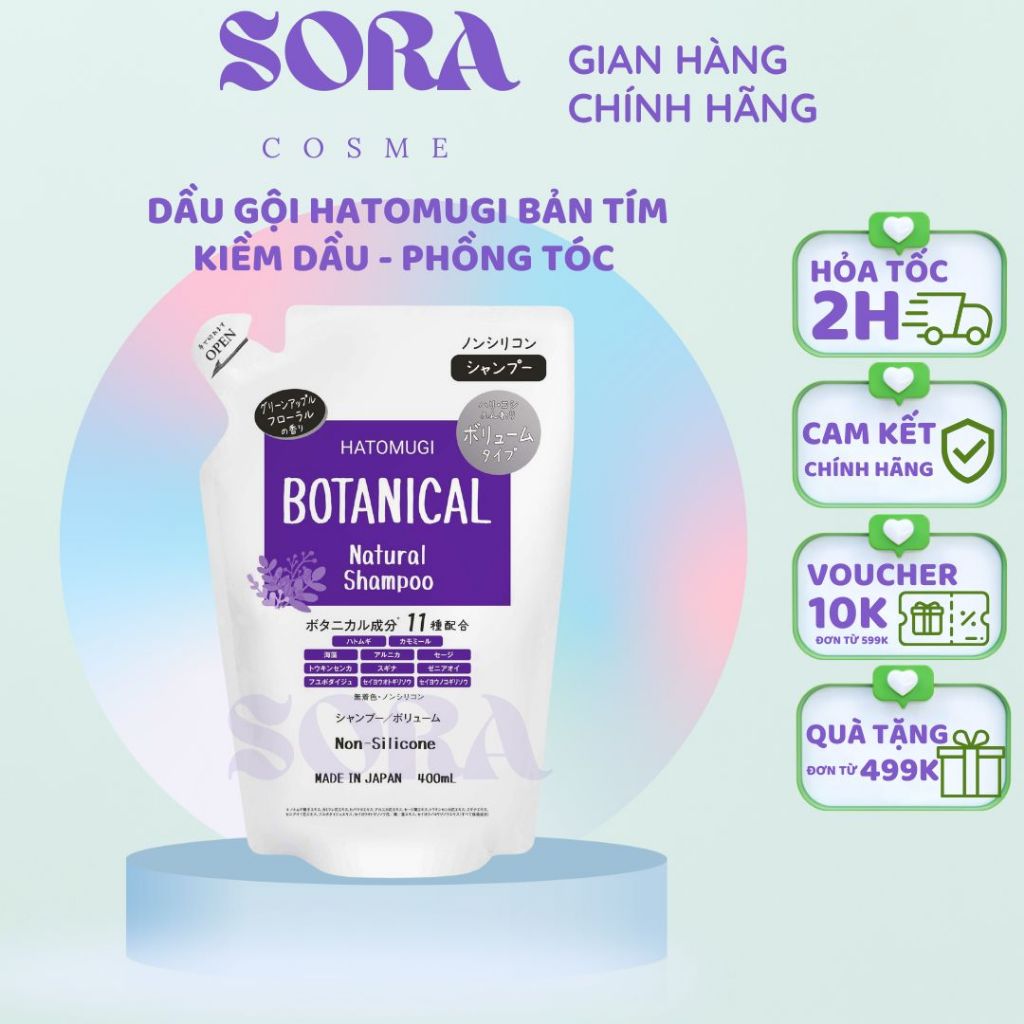 [MẪU MỚI] Gội xả HATOMUGI BOTANICAL Nhật Bản kiềm dầu phồng tóc, giảm rụng mọc tóc, gội xả không silicon 400ml
