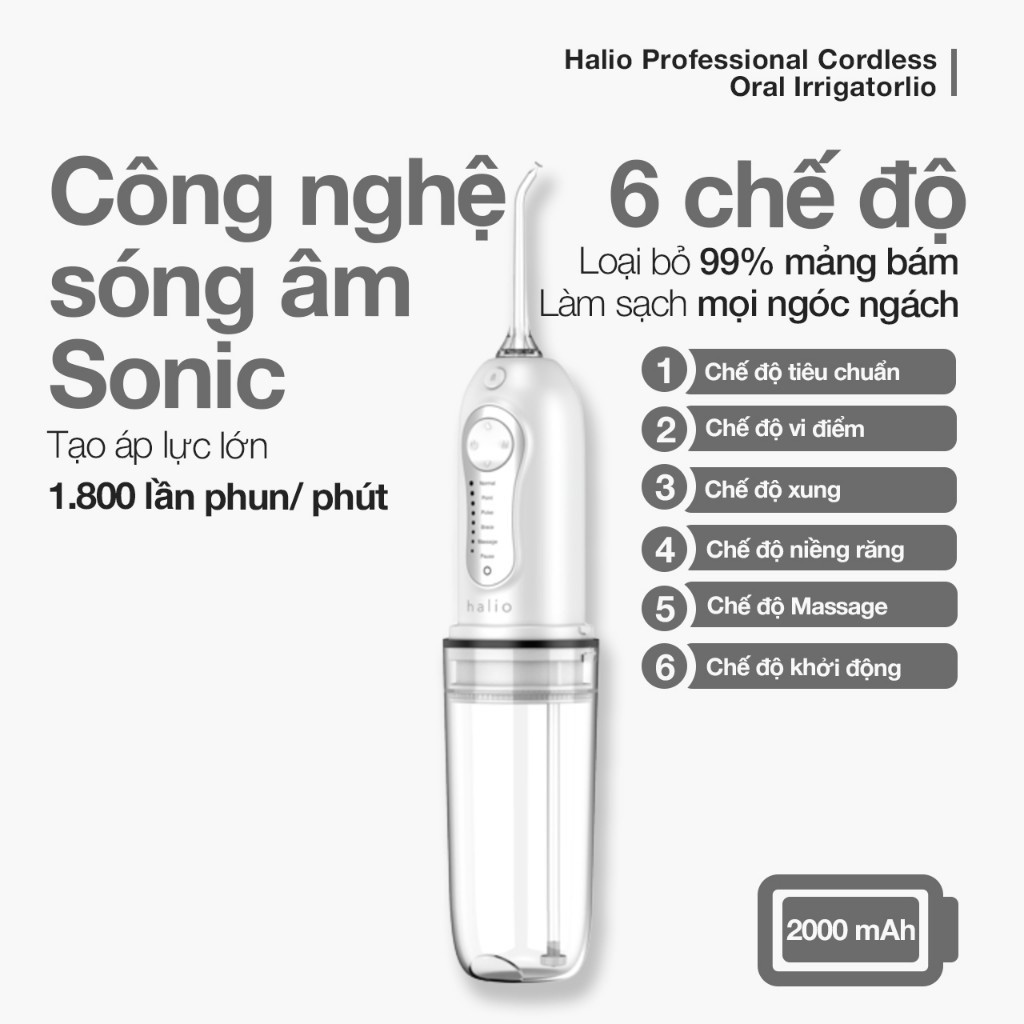Máy Tăm Nước Cầm Tay 6 Chế Độ Halio Professional Cordless - Công nghệ Sóng Âm Sonic - Pin 25 Ngày
