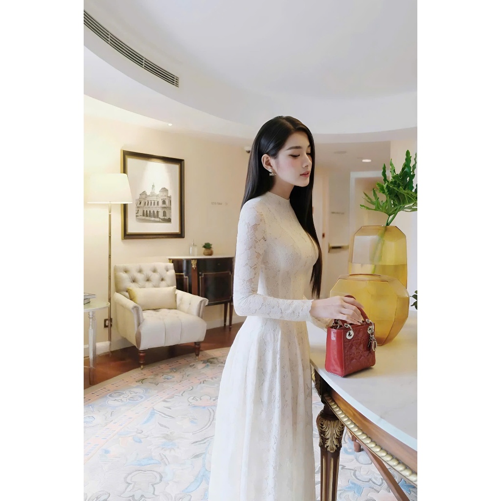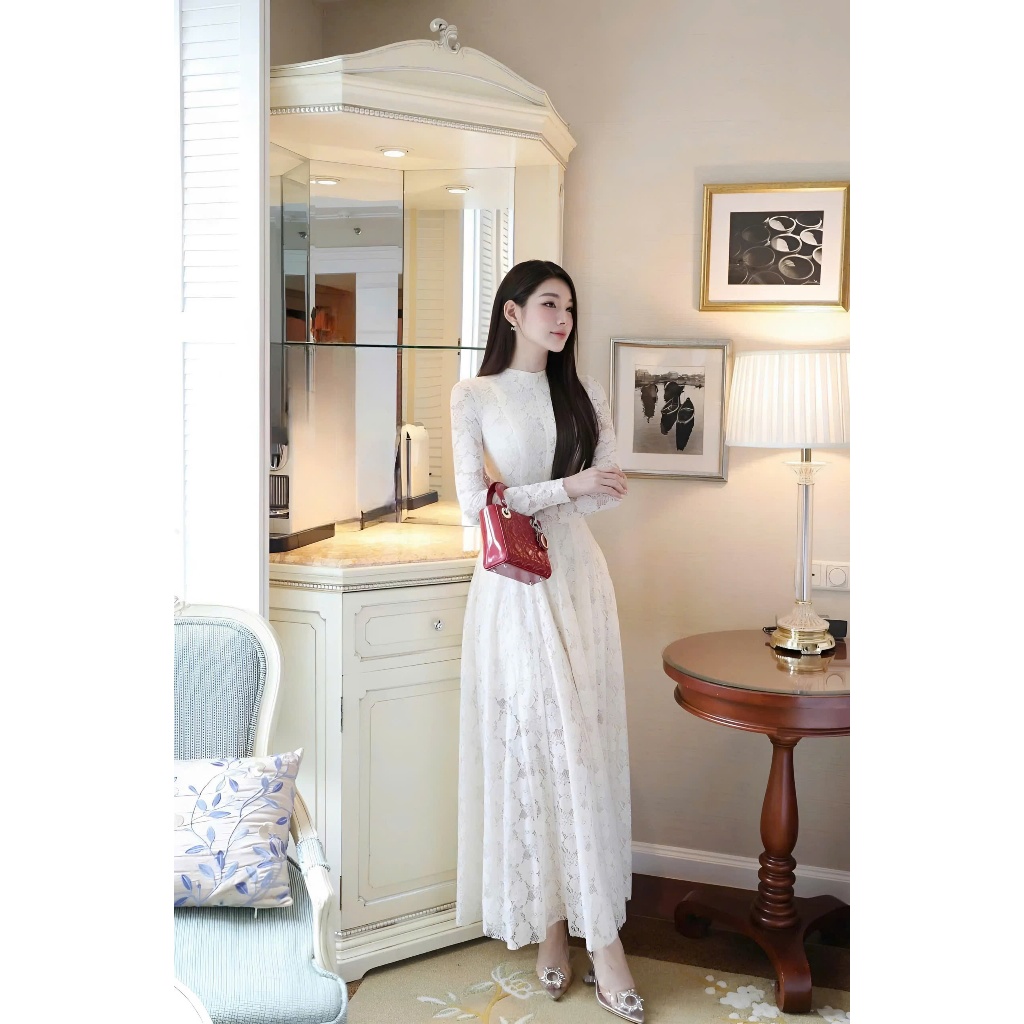 Đầm váy nữ ren trắng kem dài tay dáng maxi 2 lớp, Đầm dài tay nữ thiết kế basic CHOUCHOU TỰ MAY LẠI