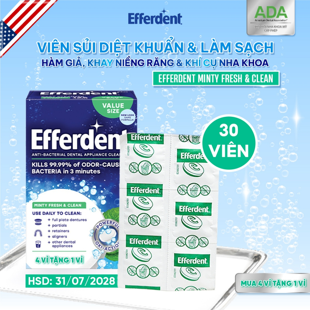 Viên Sủi Vệ Sinh Hàm Duy Trì Efferdent Minty Fresh & Clean 126v Hương Bạc Hà, Viên Ngâm Khay Niềng Răng, Khay Invisalign