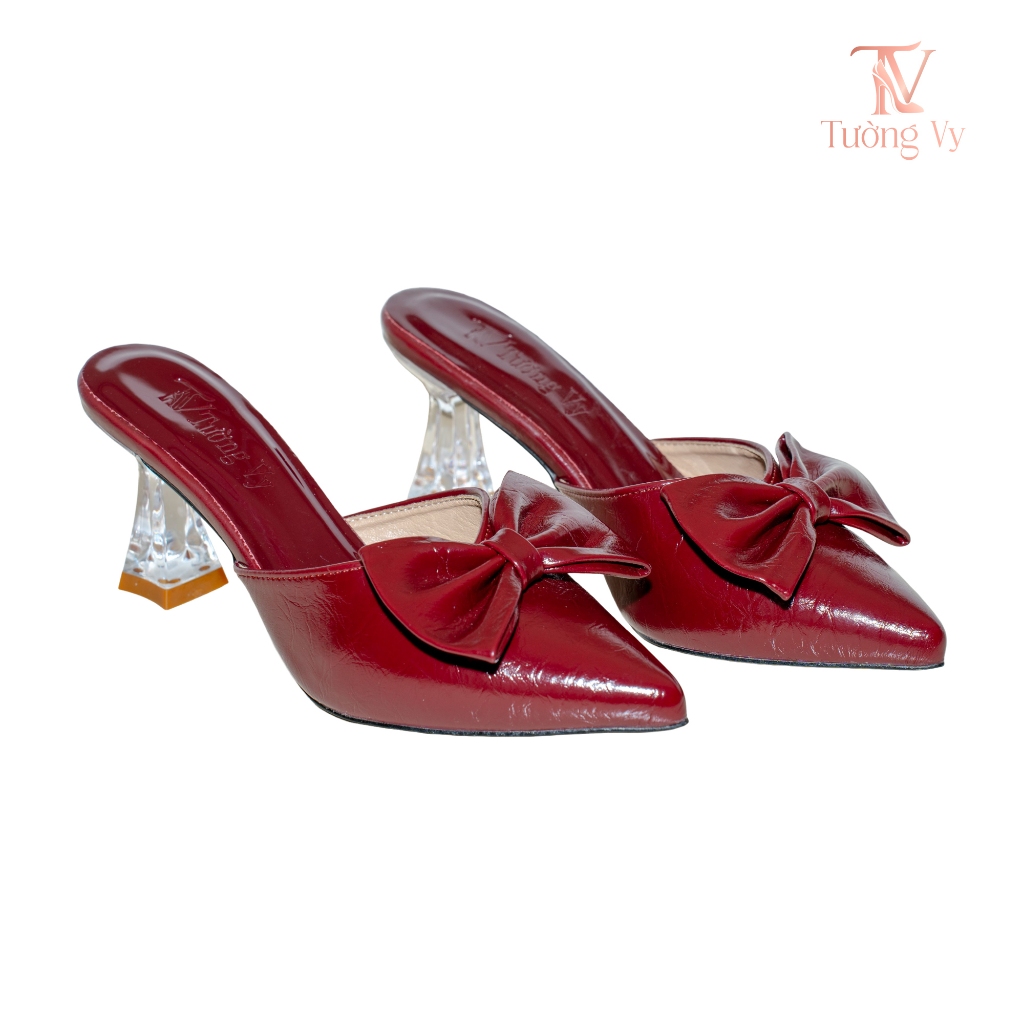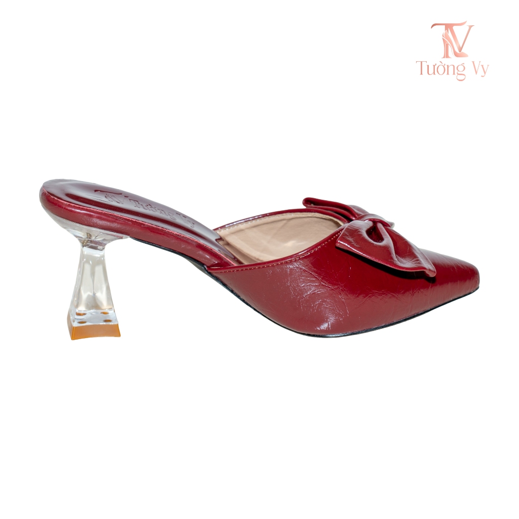 Giày Cao Gót Nữ Sục Mũi Nhọn Đính Nơ Gót Trong Suốt Màu Đỏ Mận Basic Sang Trọng Dễ Đi