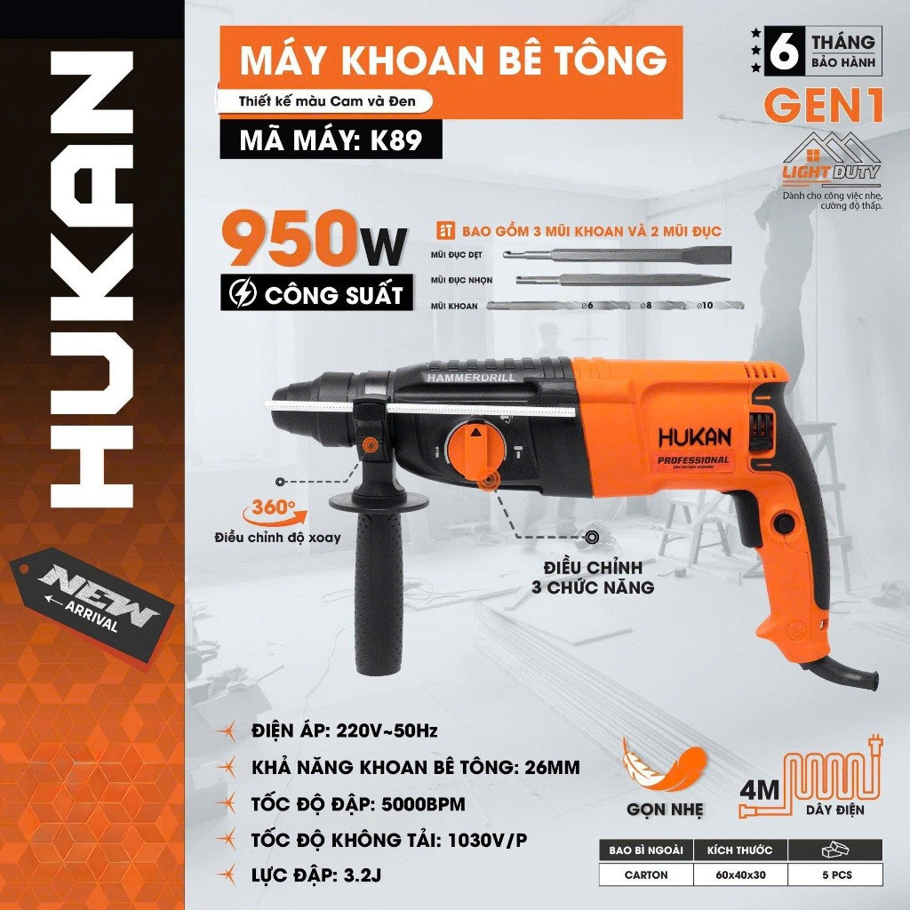 Máy khoan đục bê tông HUKAN K89 công suất 950W, 3 chức năng đa dụng, kèm tặng bộ 5 mũi khoan và đục chuyên dụng theo máy