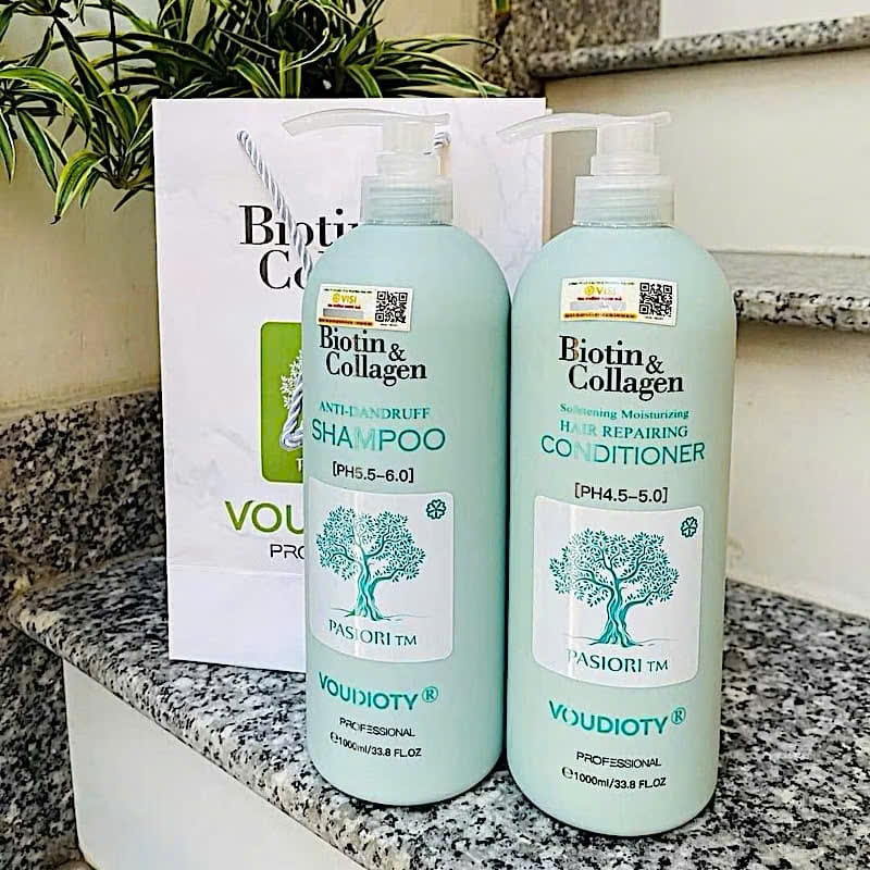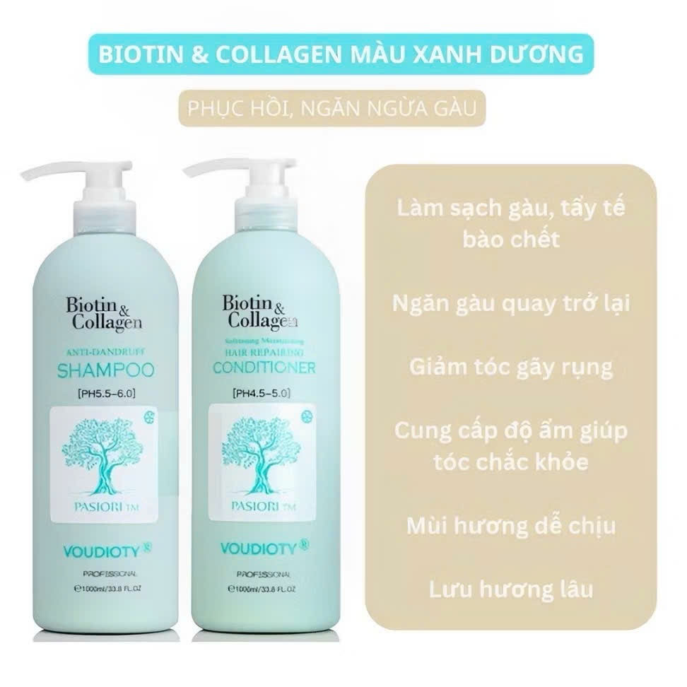 Cặp Dầu Gội Xả Biotin Collagen Voudioty Xanh Dương 500ml-1000ml 2024. Ngăn Gàu Phục Hồi Tóc Khô Xơ Hư Tổn