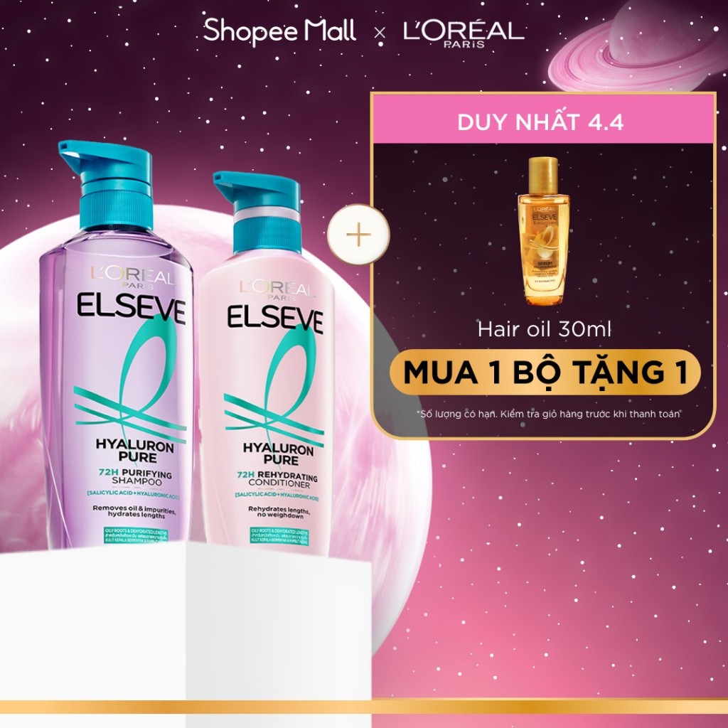 Bộ đôi gội xả nhẹ bồng mái tóc 72H Elseve HA Pure cho da đầu dầu hoặc Moist cho da đầu khô L'Oreal Paris 620ml, 375ml