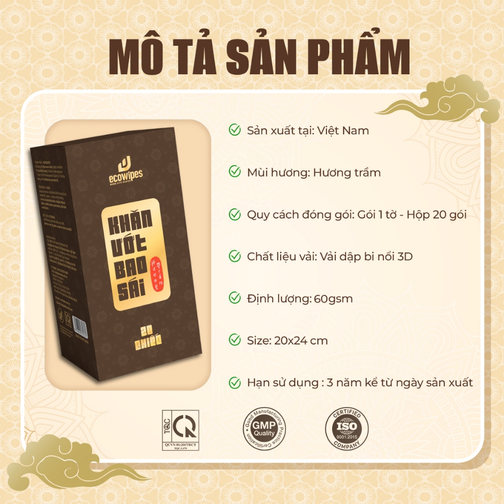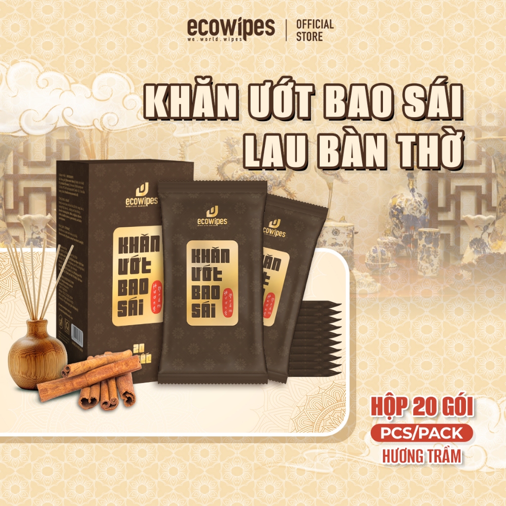 KHO THỦ ĐỨC_Thùng 05 hộp x 20 gói khăn ướt bao sái lau bàn thờ Ecowipes Hương Trầm (tổng 100 gói)