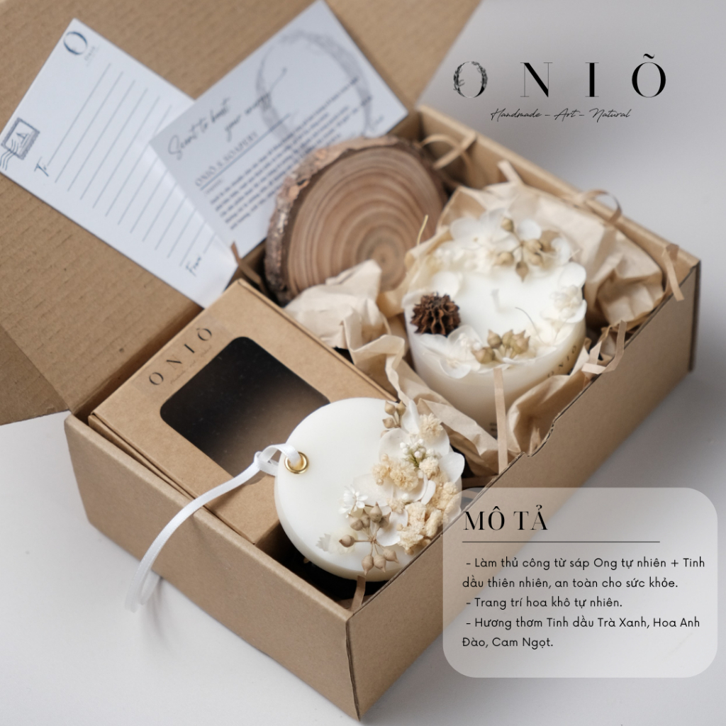 Bộ quà tặng nến, sáp thơm và đế gỗ thông ONIÕ, hương tinh dầu thiên nhiên, handmade 100%, GS-002