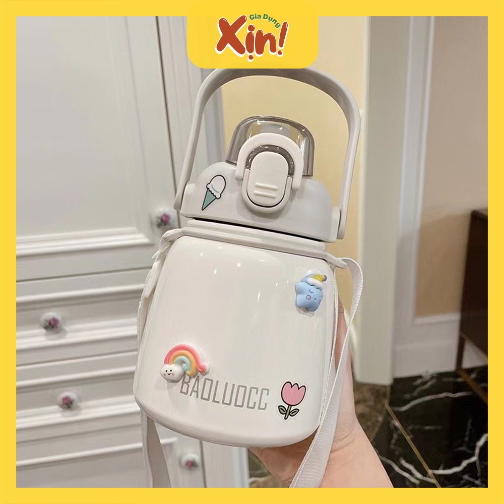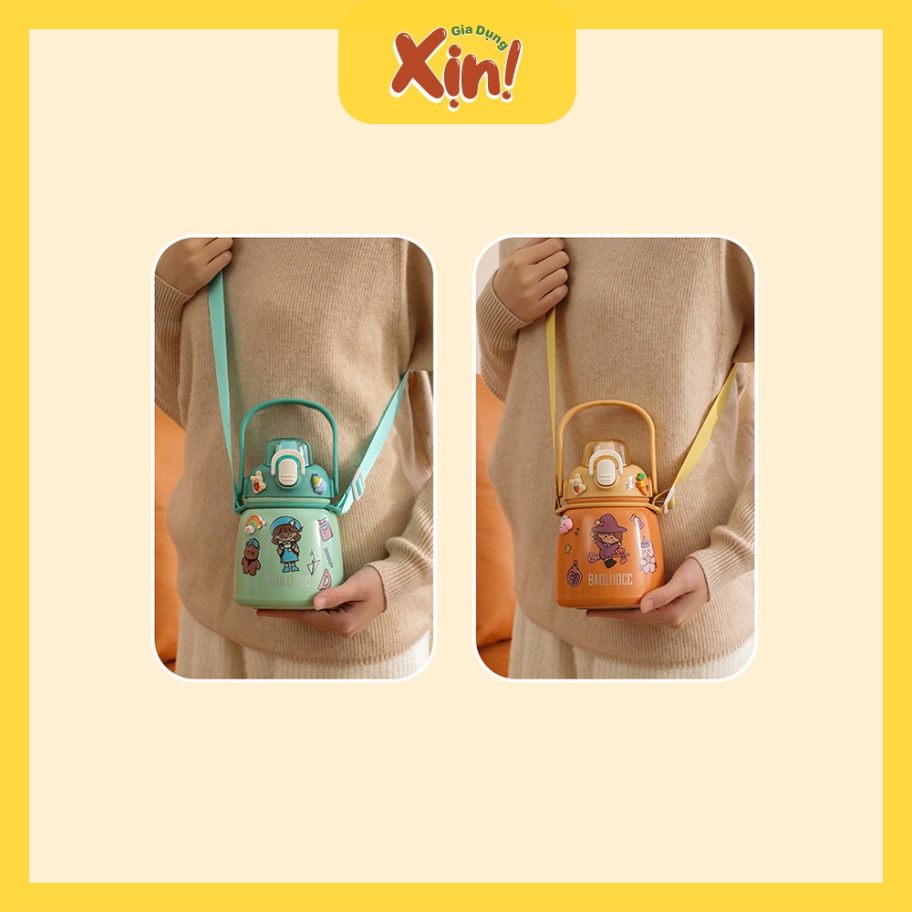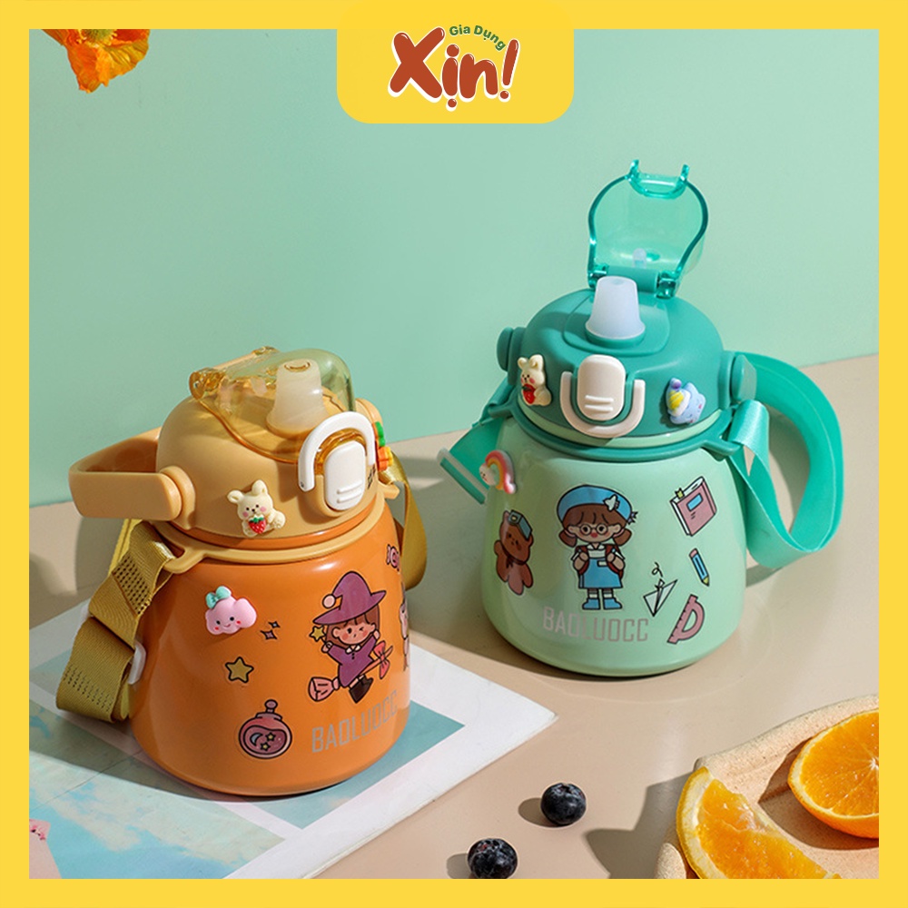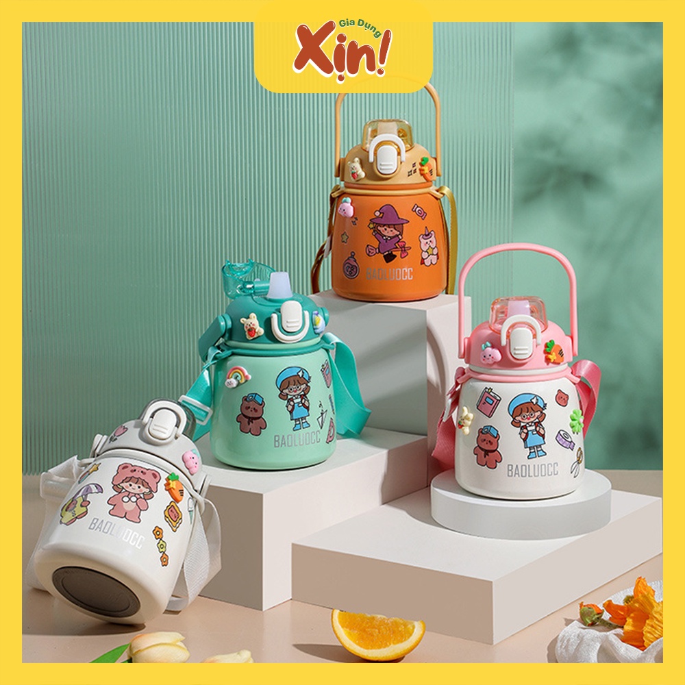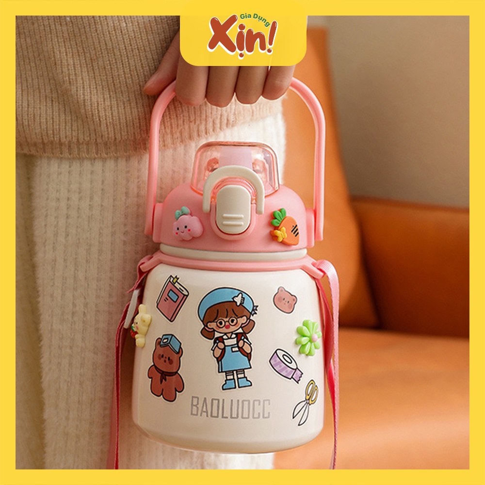 Bình giữ nhiệt cho bé đi học cao cấp 650ml, bình nước dễ thương 2 lớp bằng inox 304 kèm ống hút, dây đeo và sticker 3D