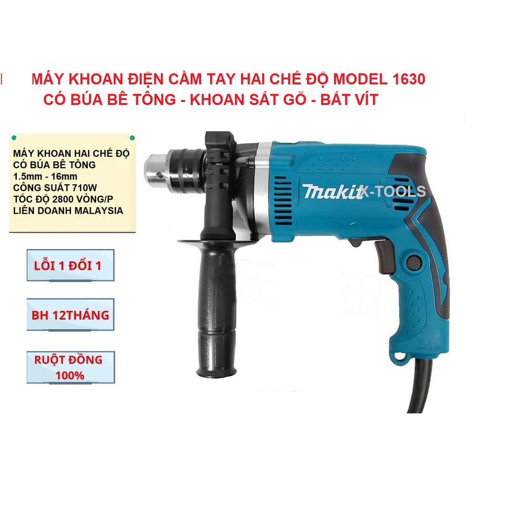 Máy Khoan Búa Bê Tông MKT 1630 Motor Đồng, Máy Khoan Điện 2 Chế Độ Khoan Tường Sắt Gỗ Bắt Vít