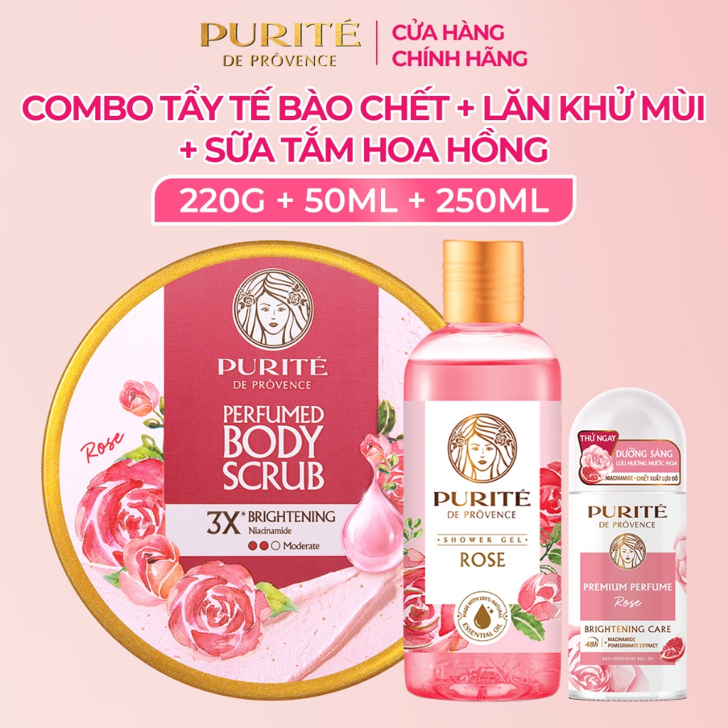 Combo Tẩy Tế Bào Da Chết Dưỡng Sáng PURITÉ Hương Nước Hoa Anh Đào/Hoa Hồng 220G & Sữa Tắm 250ML & Lăn Khử Mùi 50ML