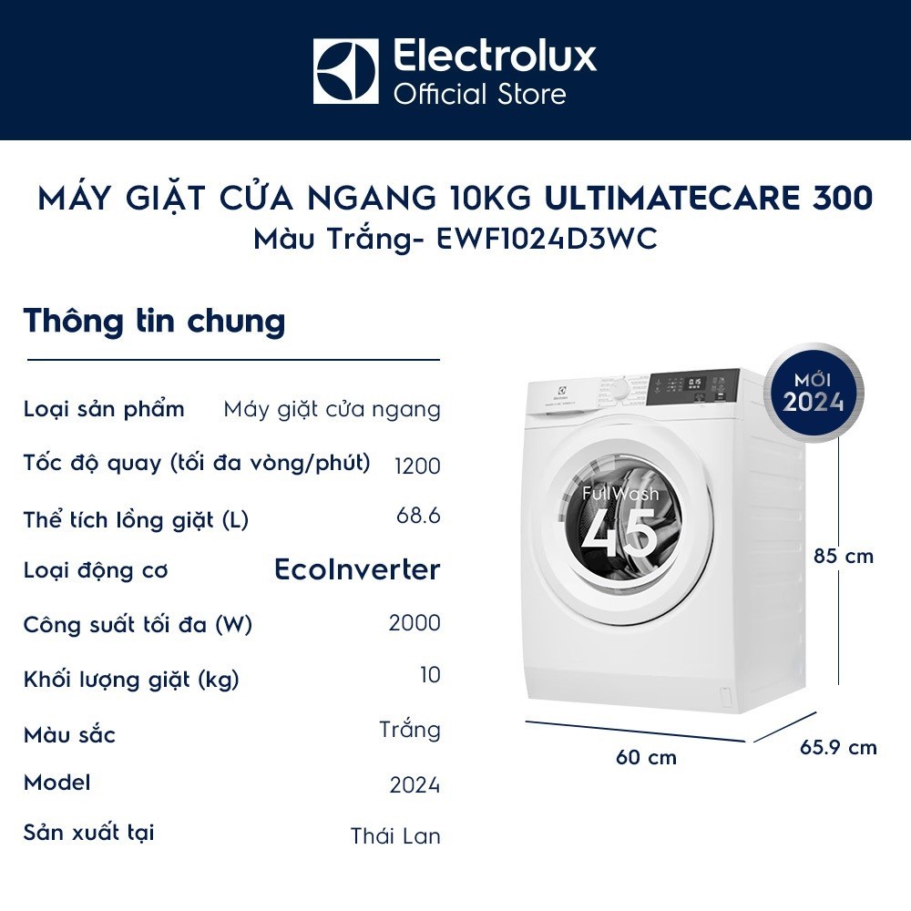 Máy giặt cửa ngang Electrolux EWF1024D3WC 10kg UltimateCare 300 - Trắng