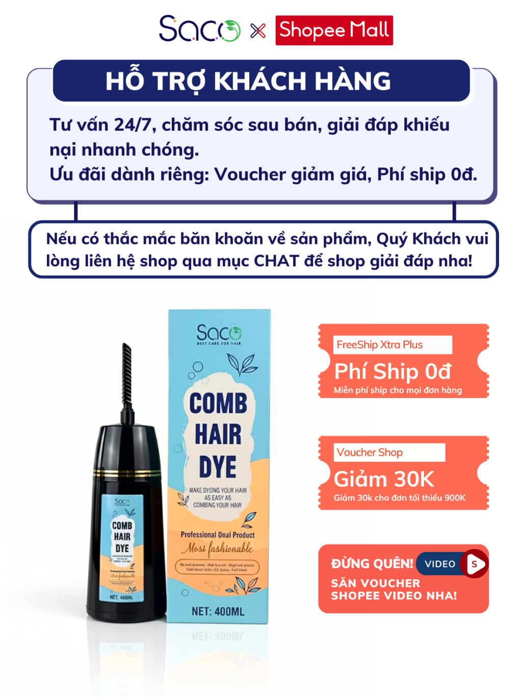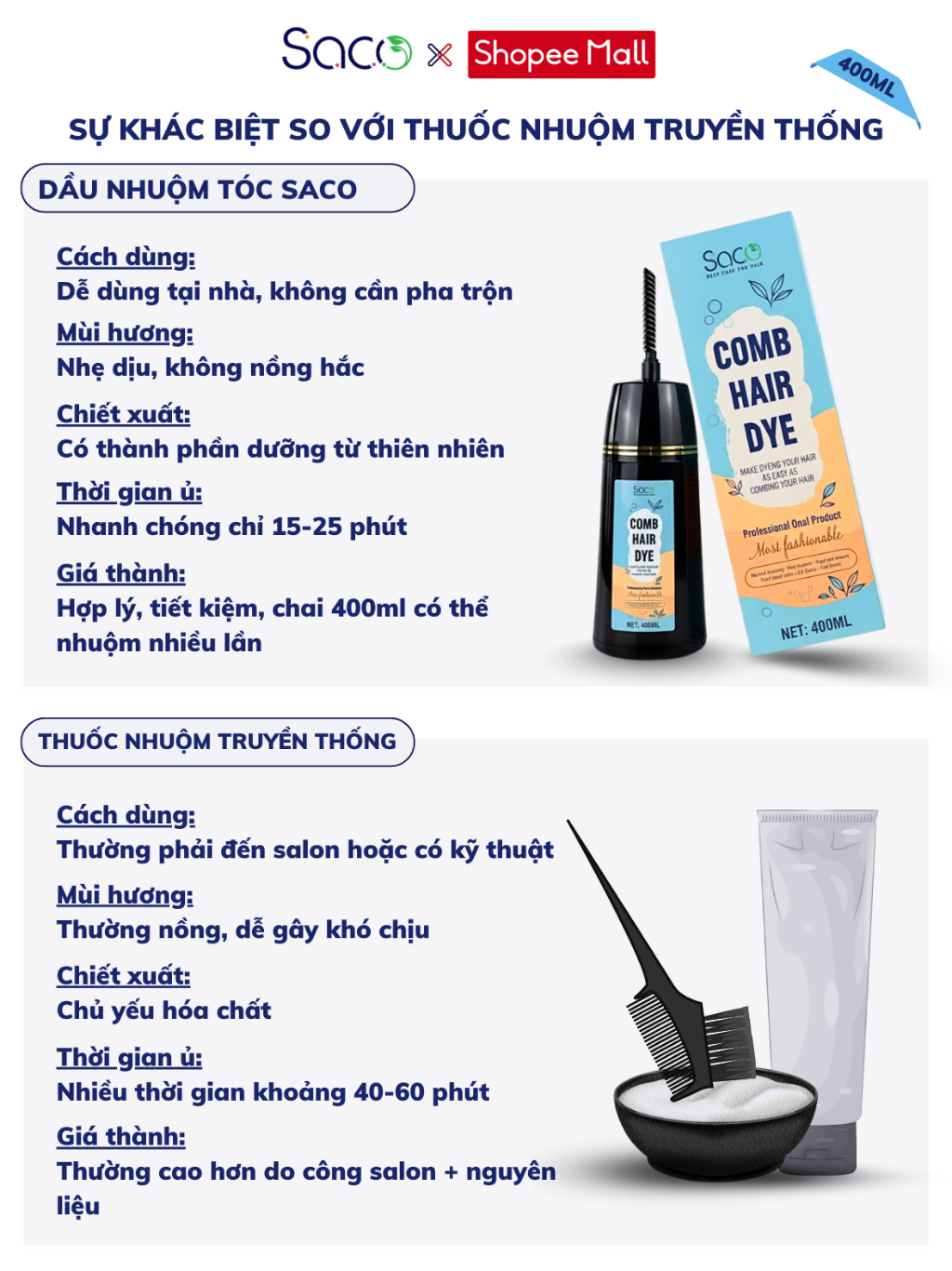 Dầu nhuộm tóc chính hãng SACO 400ml, hương thảo dược dễ chịu, không tẩy, lên màu nhanh chỉ 15p