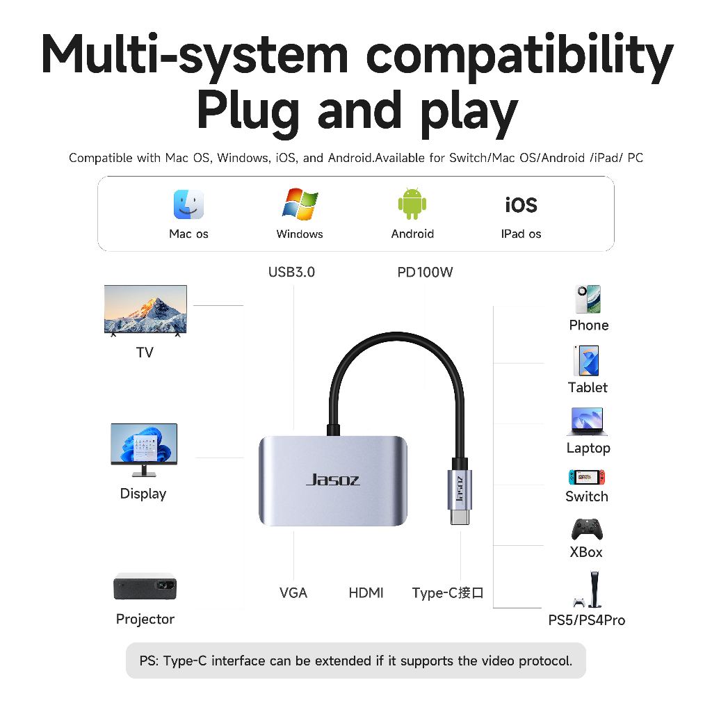Hub Type-C 4-in-1 Jasoz – USB 3.0 5Gbps + HDMI 4K + VGA 1080p + PD 100W – Mở rộng kết nối cho Laptop MacBook