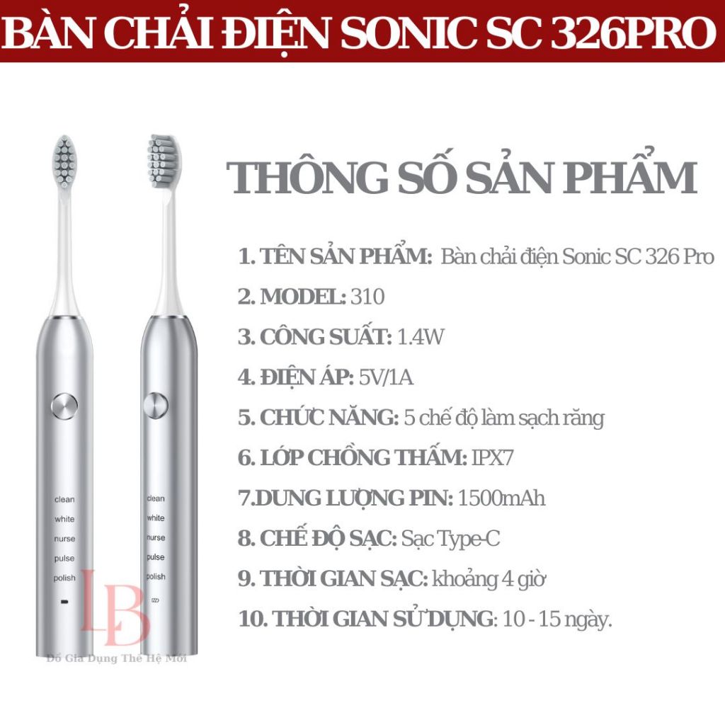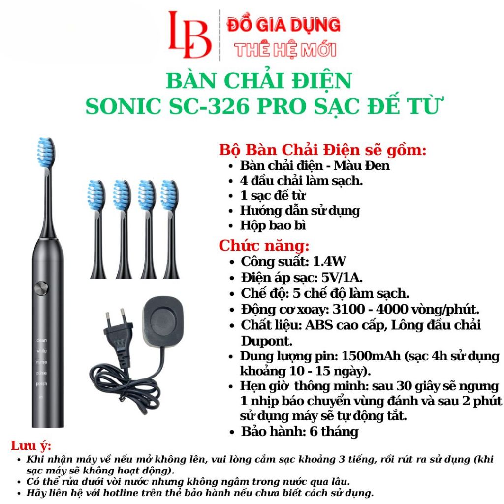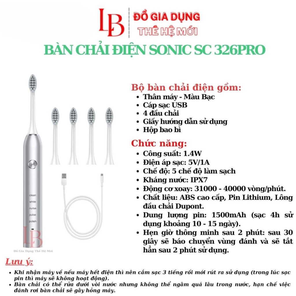 Bàn chải điện SC326 Pro, bàn chải đánh răng điện rung sóng âm siêu mạnh chống nước IPX7 lông mềm bản 2025