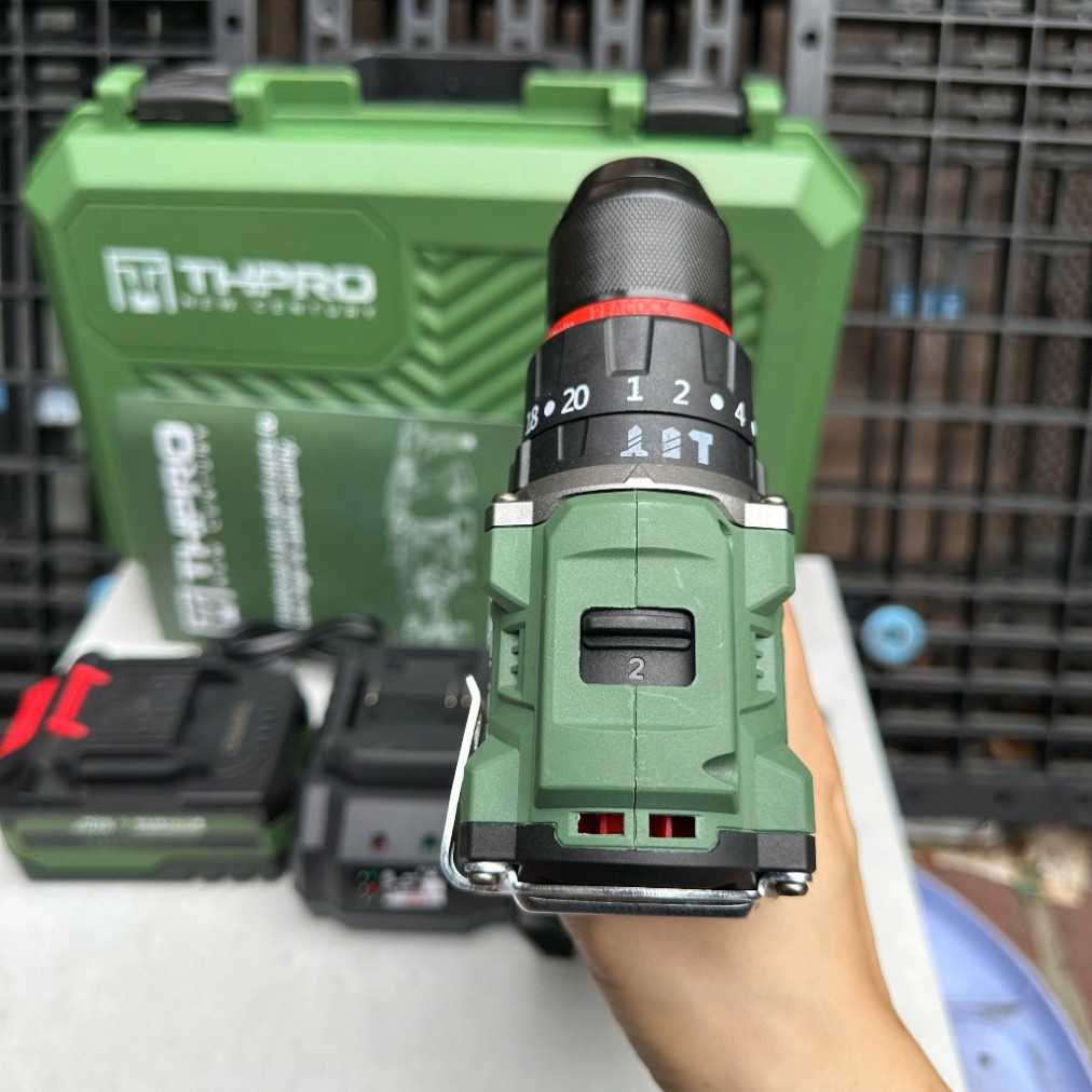 Máy khoan pin THPRO TH10 xanh lá 3 chức năng, chân phổ thông M21, Không chổi than, Đầu kẹp thép autolock