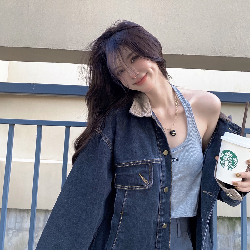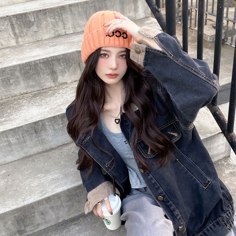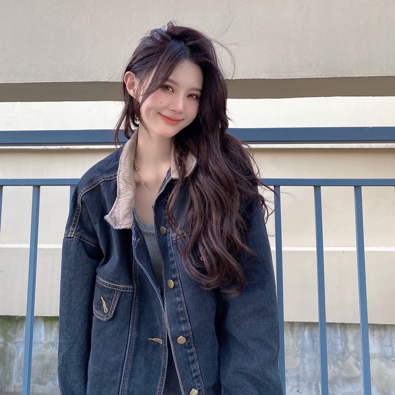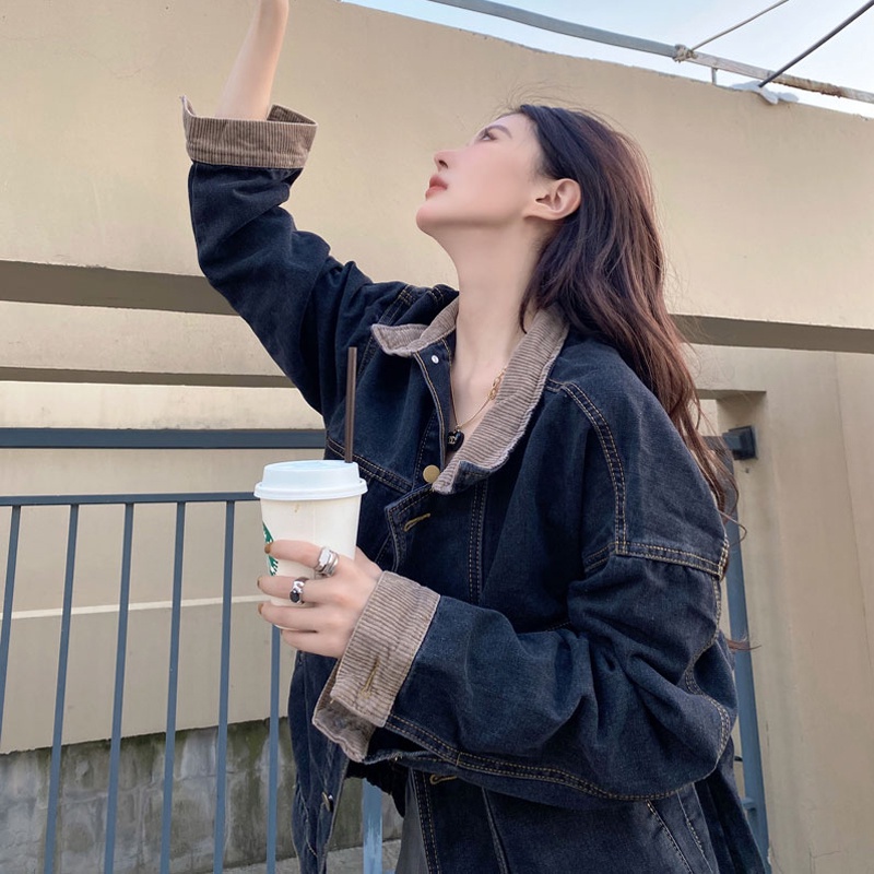 Áo khoác denim ngực đơn dài tay dáng rộng cổ điển IELGY dành cho nữ