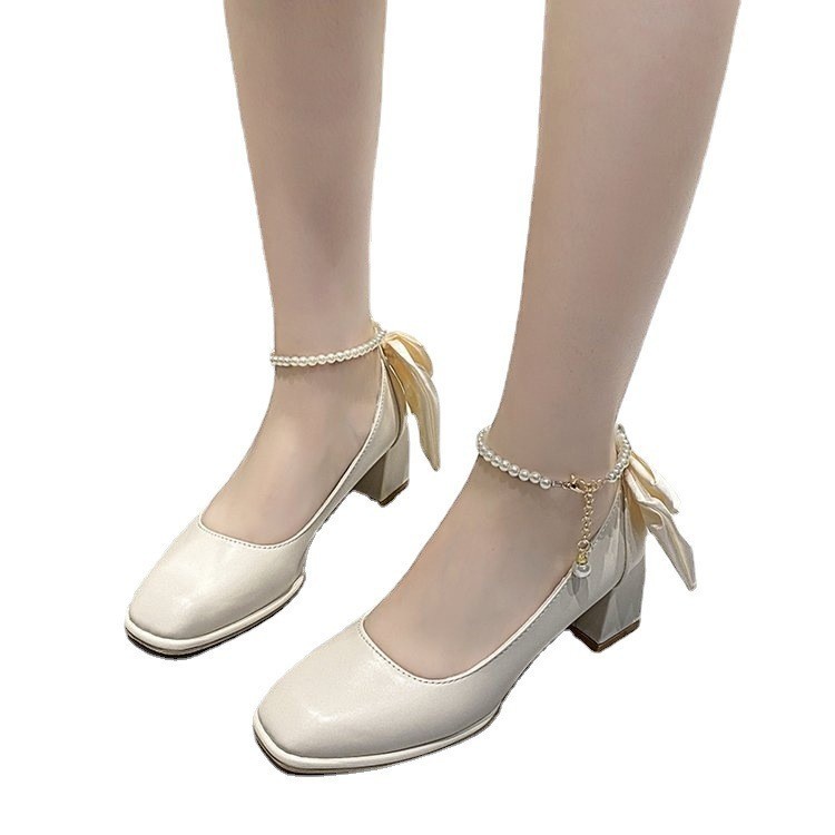 IELGY Giày Cưới Đỏ Khối Gót Vuông Ngón Chân Bướm Nút Giày Cao Gót Nữ Trắng Hai Mặc Ngọc Trai Cô Dâu