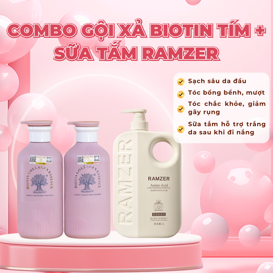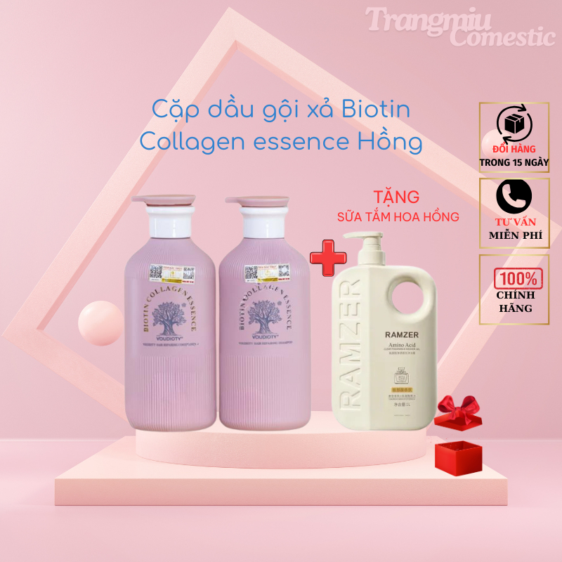 Combo Cặp Dầu Gội Xả Biotin Collagen essence Hồng Và Sữa Tắm Ramzer Chính Hãng