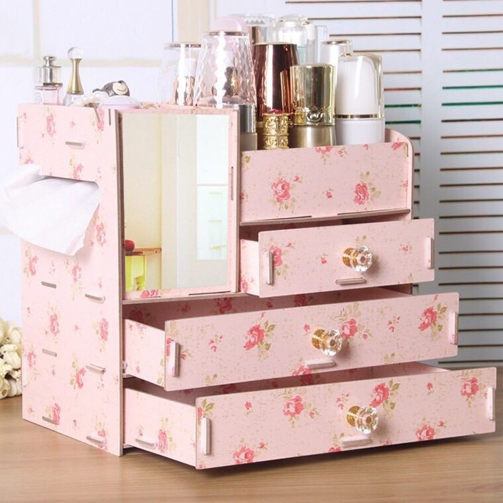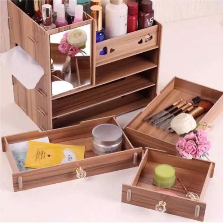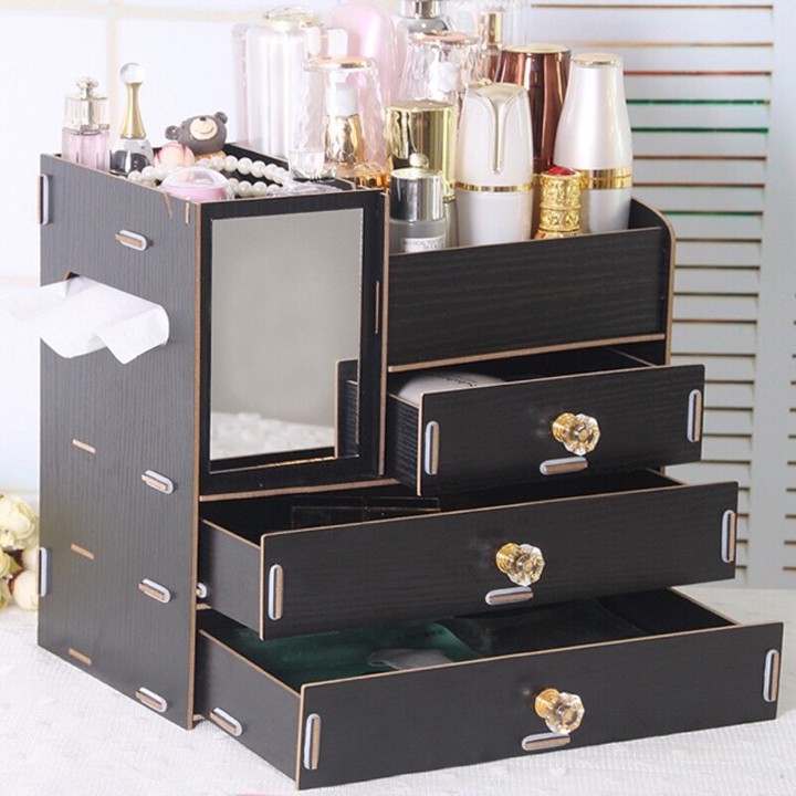 Kệ để mỹ phẩm 4 tầng cao cấp bằng gỗ có gương có núm cầm