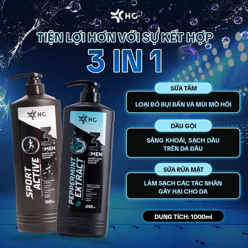 Sữa Tắm Gội Cho Nam HC Men 3in1 Thái Lan Sạch Sâu, Mát Lạnh 1000ml/chai
