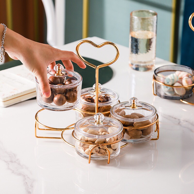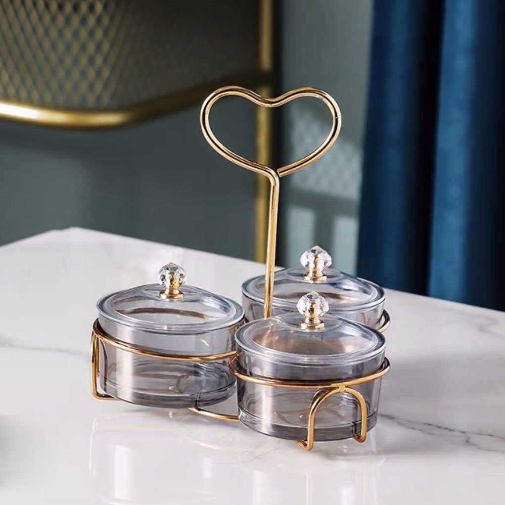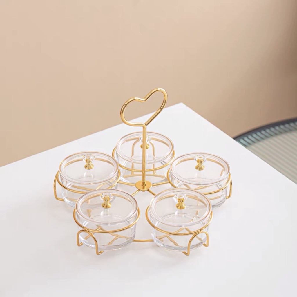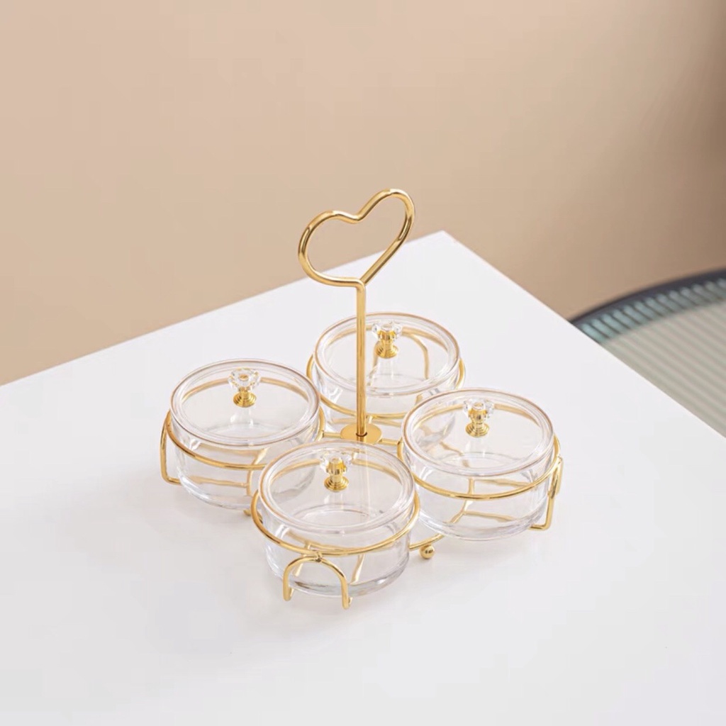 Khay đựng bánh kẹo tết hũ thủy tinh đựng mứt tay cầm trái tim khung kim loại cao cấp - VS101