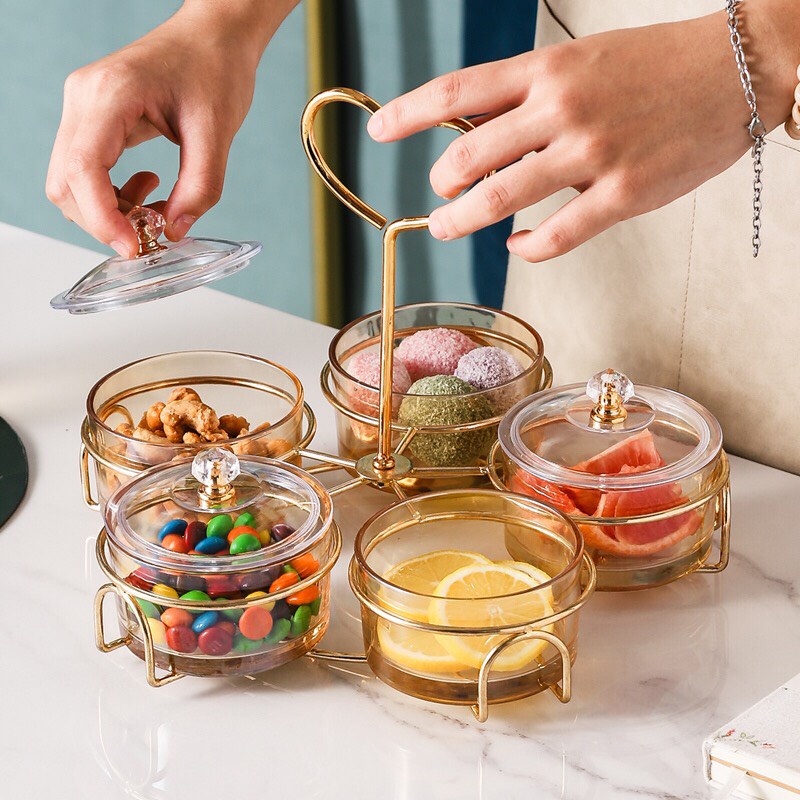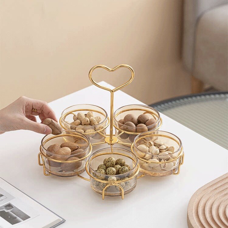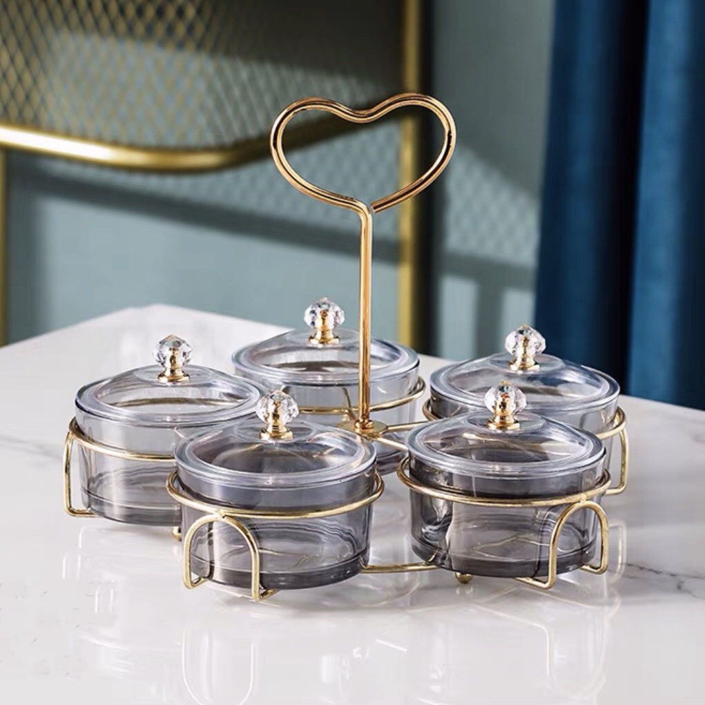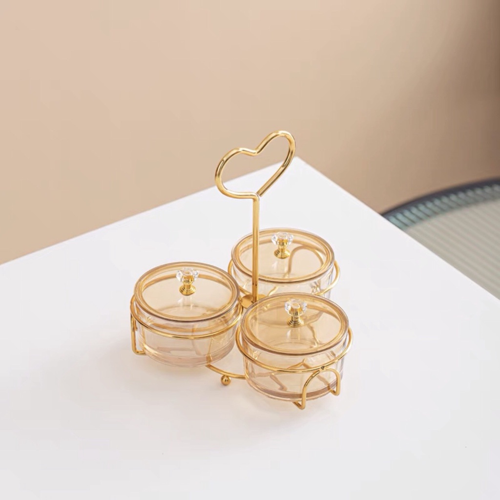 Khay đựng bánh kẹo tết hũ thủy tinh đựng mứt tay cầm trái tim khung kim loại cao cấp - VS101