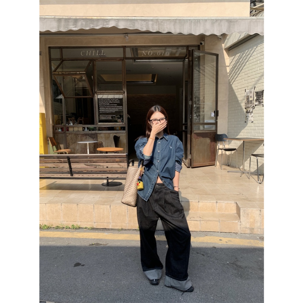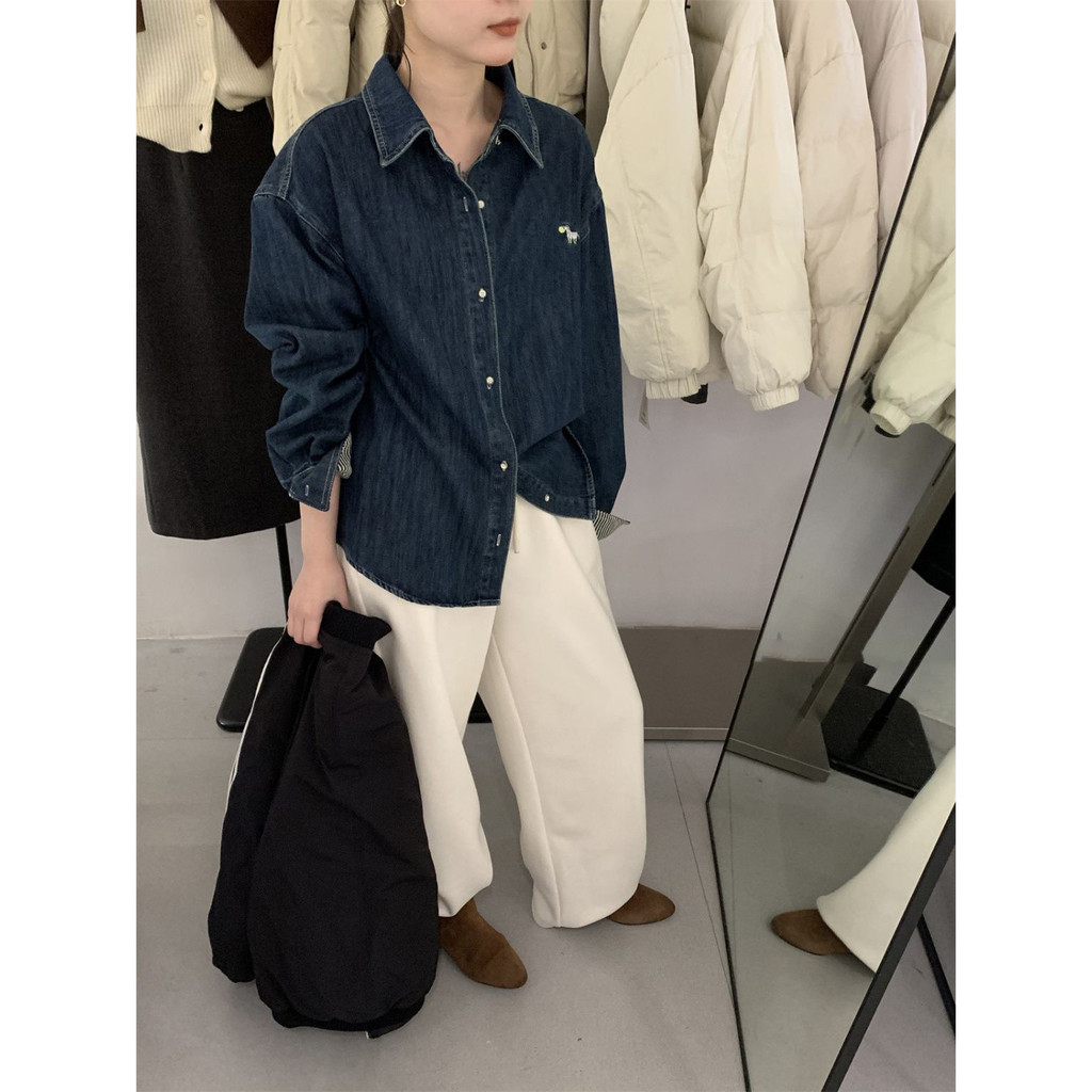 Kii Wii Áo sơ mi Denim dáng rộng thêu cổ điển mùa xuân dành cho nữ 250509