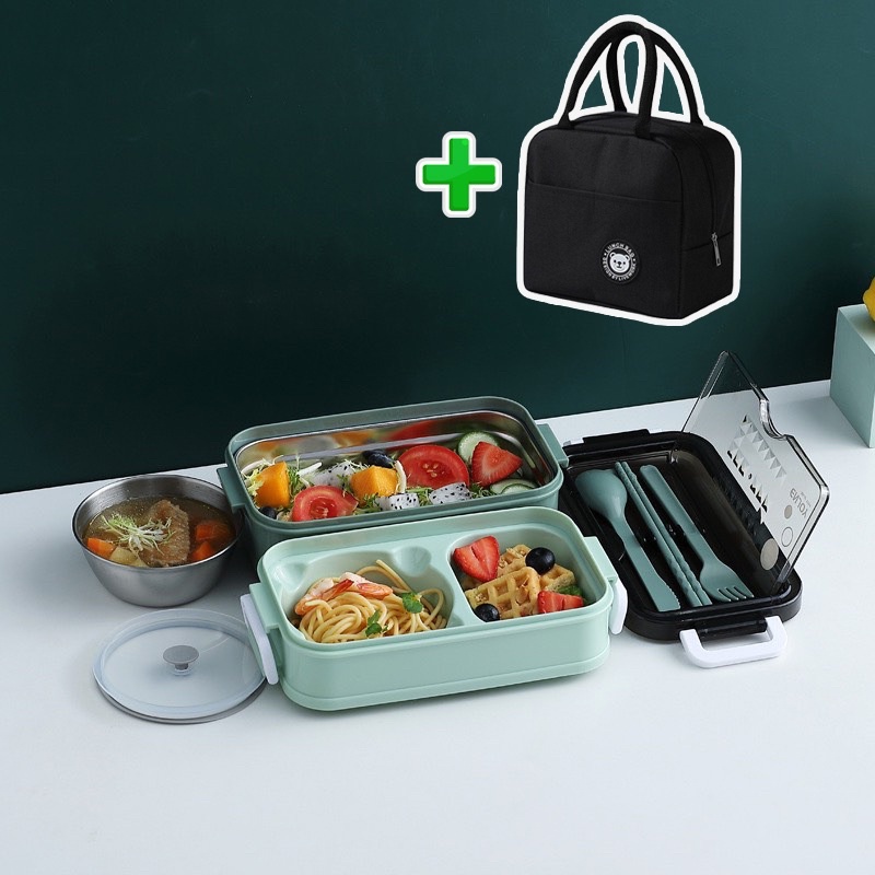 Hộp đựng cơm inox giữ nhiệt văn phòng AKIHO tặng kèm thìa đũa tiện dụng mang đi làm