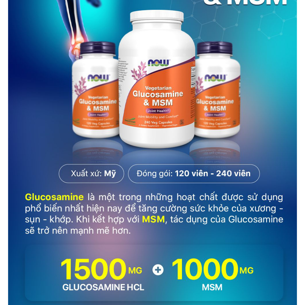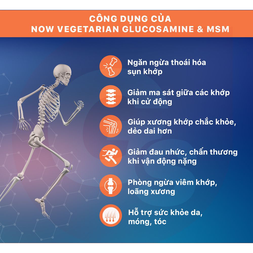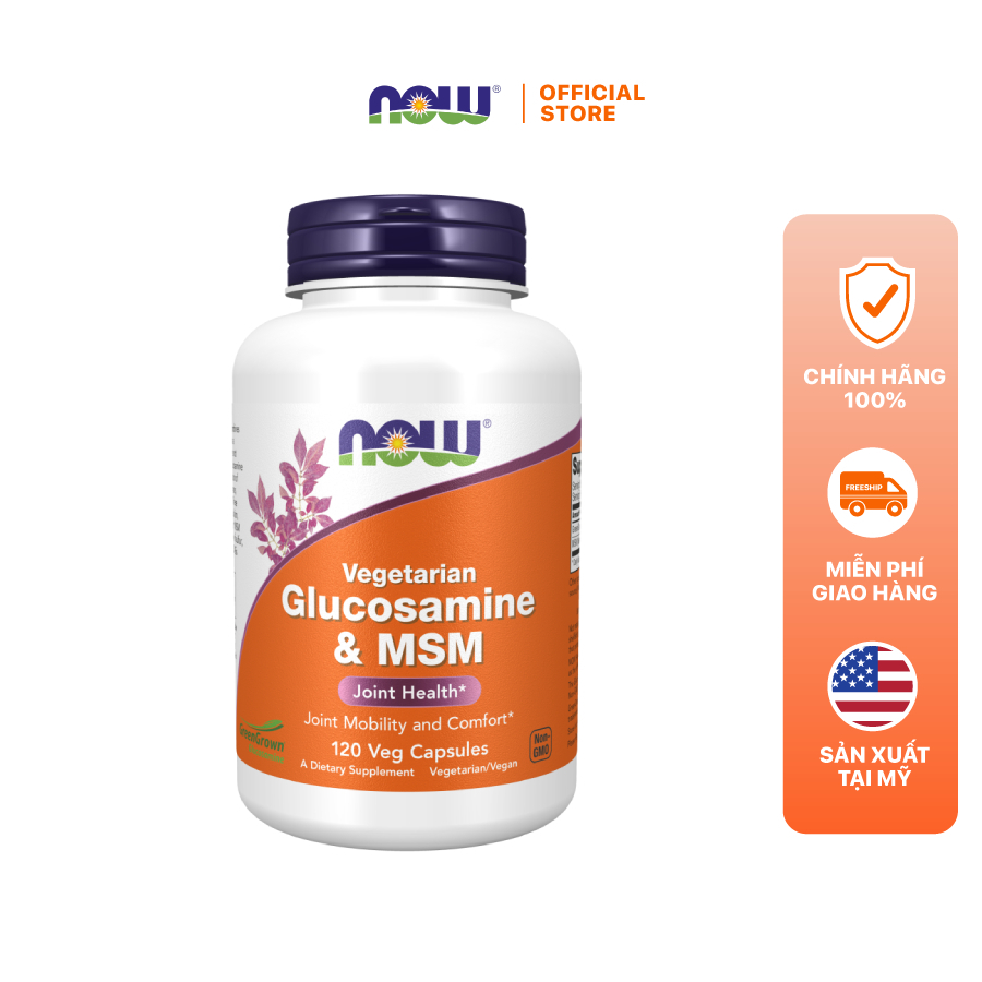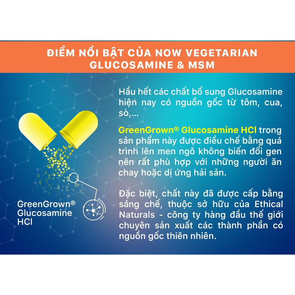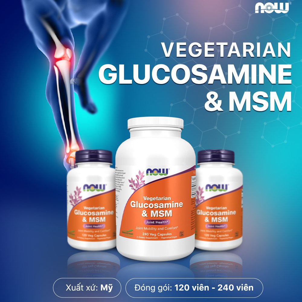 (đủ bill) Viên uống Vegetarian Glucosamine & MSM Now thuần chay, giảm sưng viêm, đau nhức sụn khớp