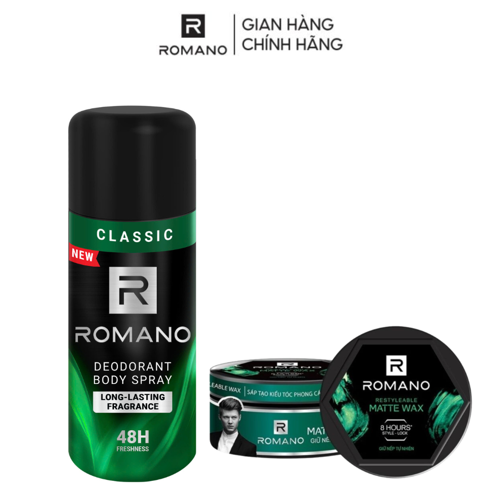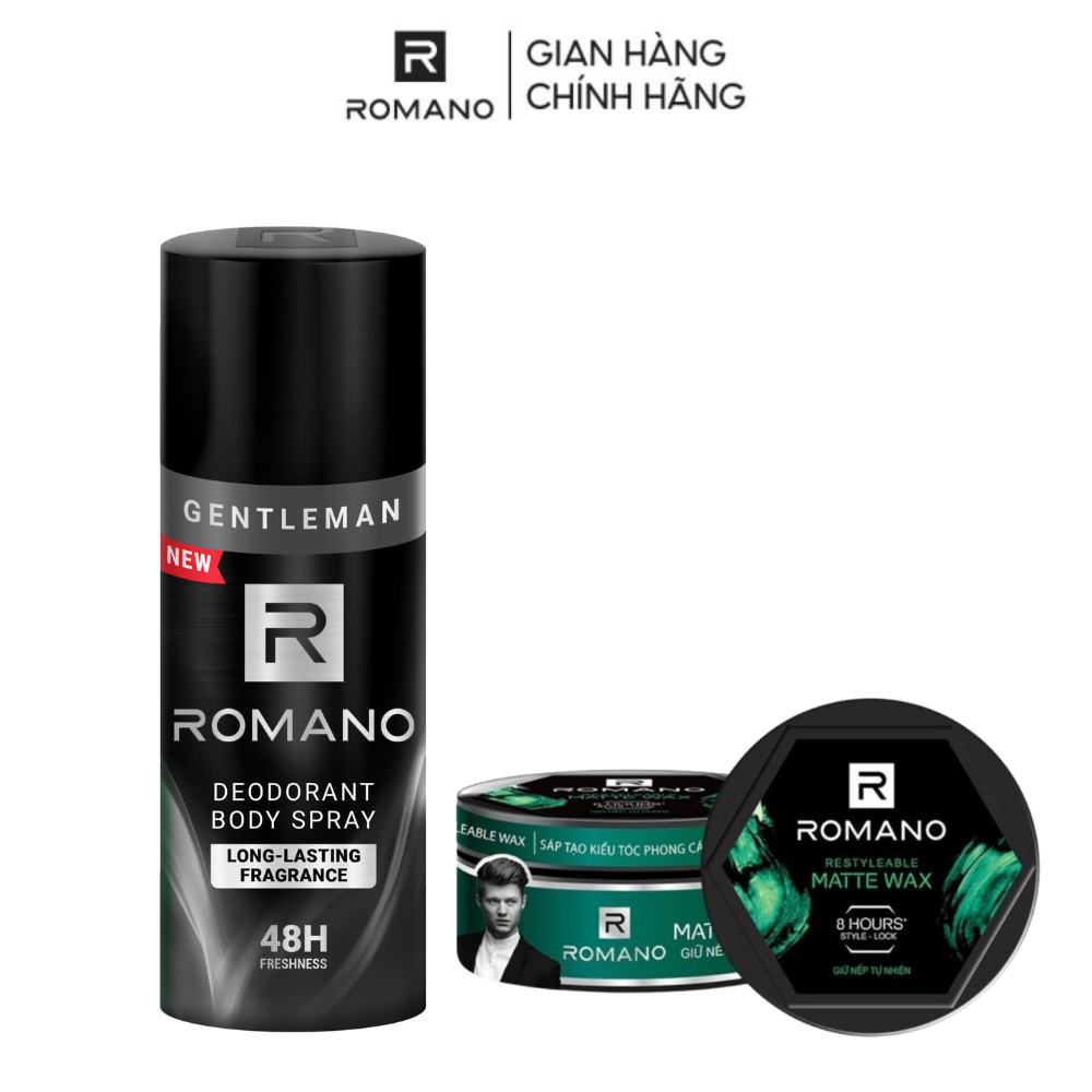 Combo xịt toàn thân Romano 150ml + Sáp vuốt tóc Romano Restyleable Wax 68g/hộp