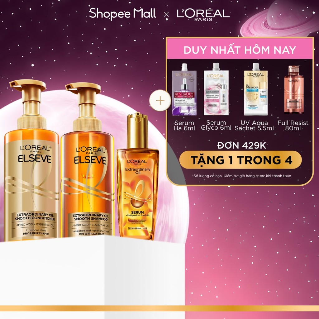 Bộ gội xả dưỡng tóc suôn mượt tóc cao cấp L'Oreal Paris Sleek 440ml x2 & Dầu dưỡng chiết xuất tinh dầu 100ml