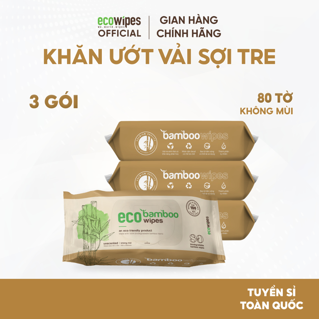 Combo 03 gói khăn ướt vải sợi tre kháng khuẩn EcoBamboo EcoWipes gói 80 tờ không mùi