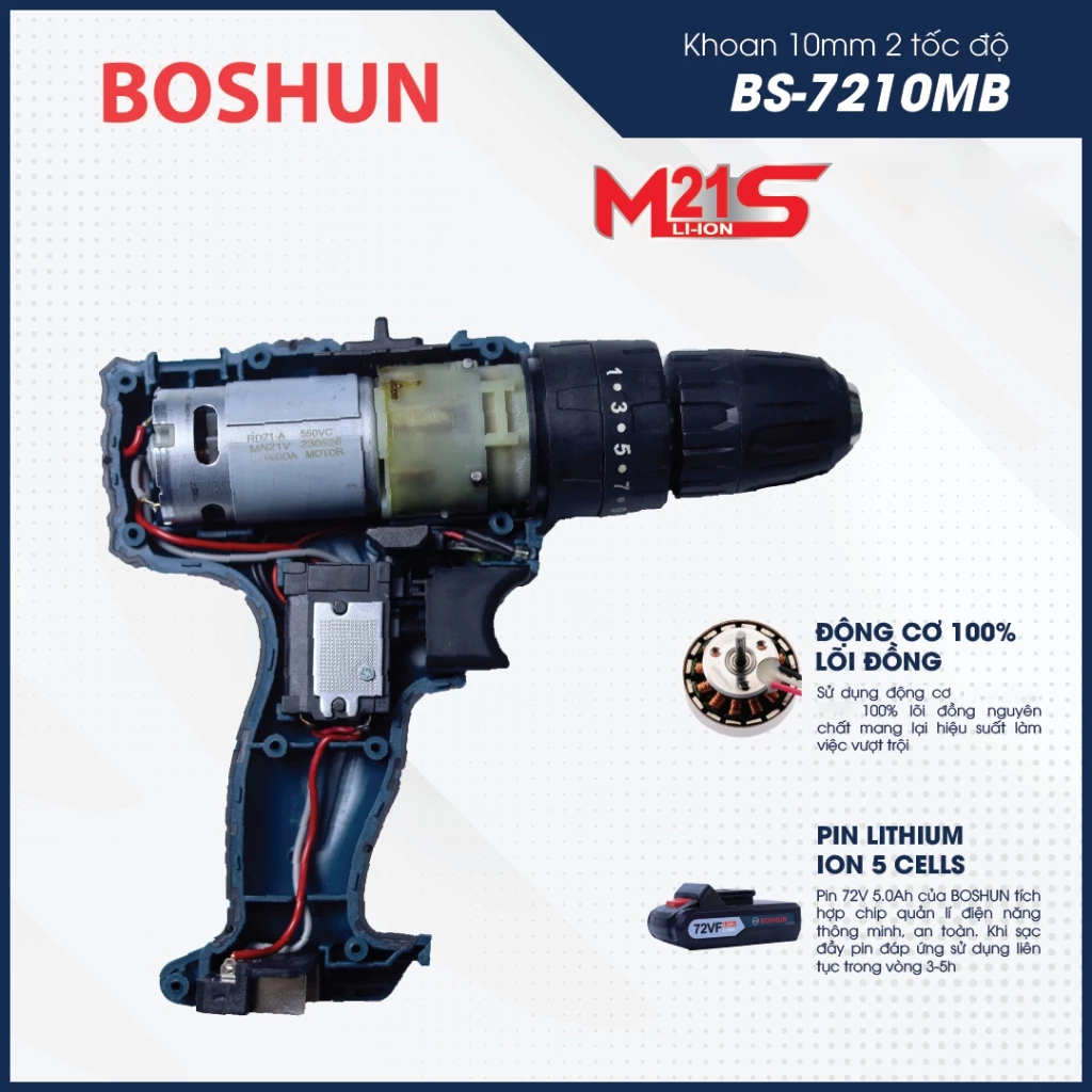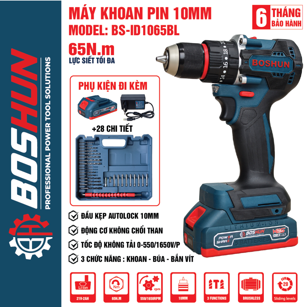 Máy Khoan Pin Boshun BS-7210MB 3 Chức Năng, Công Suất 55Nm, Đầu Kẹp 10mm, Tặng Phụ Kiện 24 Chi Tiết