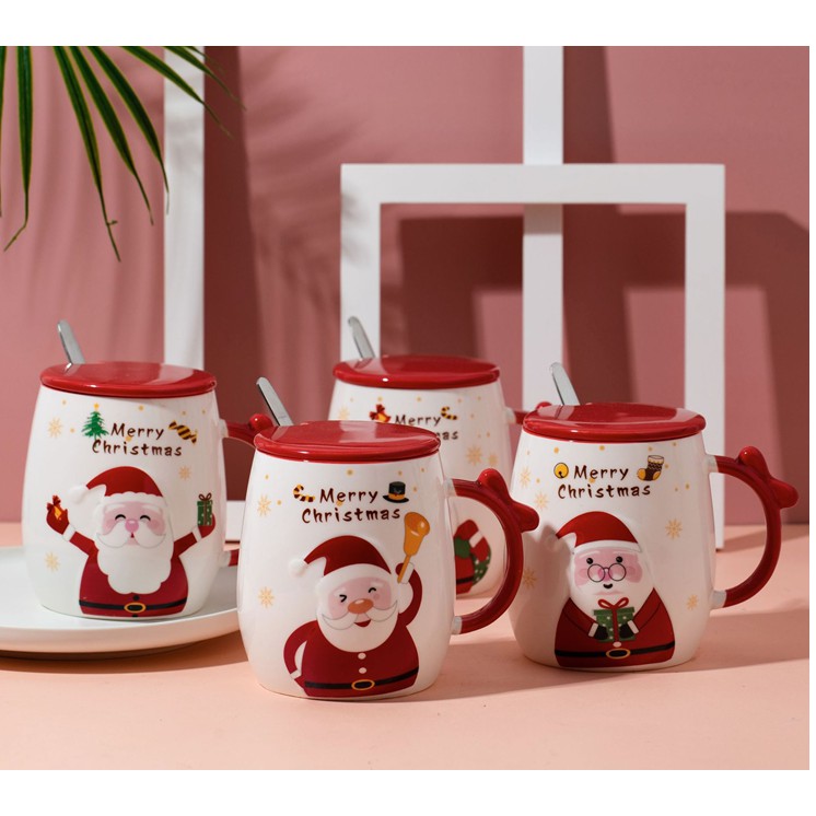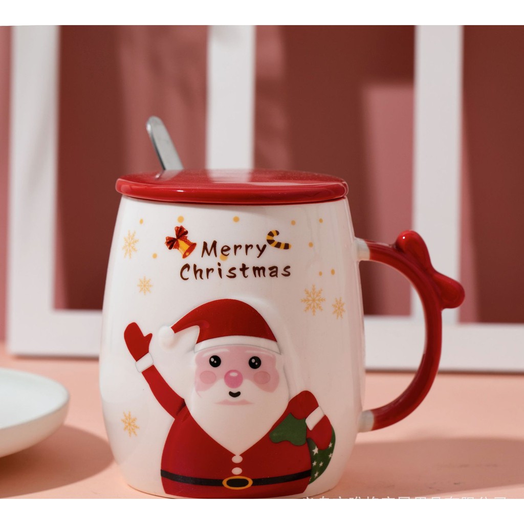 Ly cốc sứ Xmas Merry Christmas Ông già Noel kèm thìa nắp 400ml