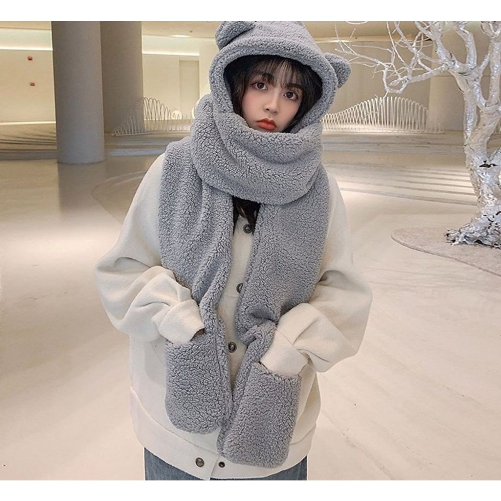 Mũ len nữ thời trang Hàn Quốc , nón lông cừu tai gấu kèm găng tay và khăn quang cổ cute ấm áp