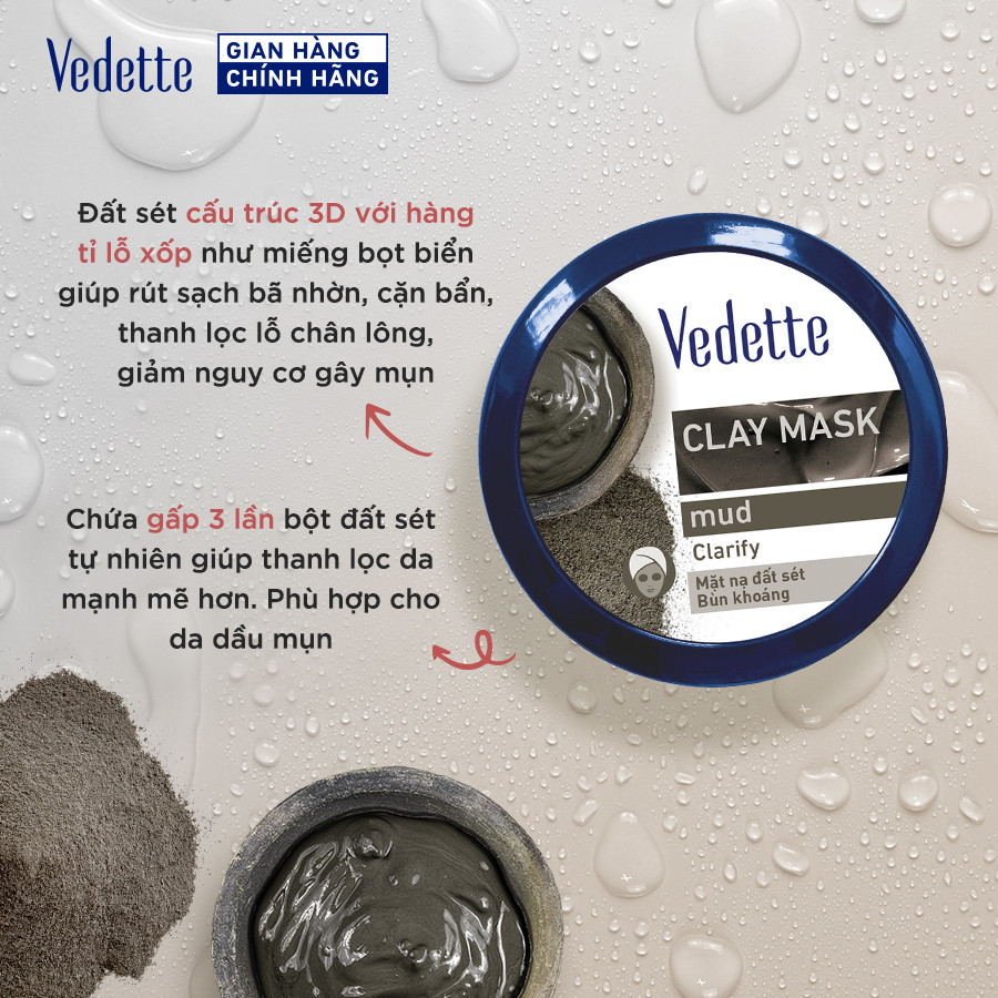Mặt nạ đất sét Vedette 145g hút dầu thừa, chất bẩn từ sâu trong lỗ chân lông. Dành cho mọi loại da.