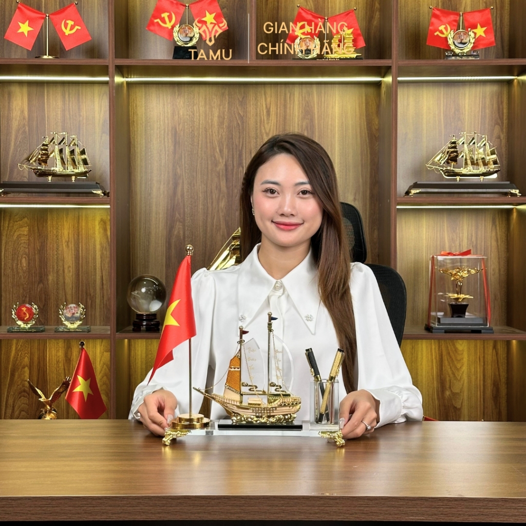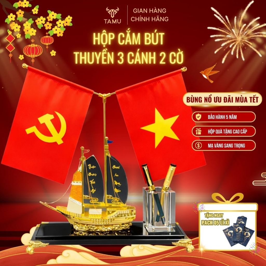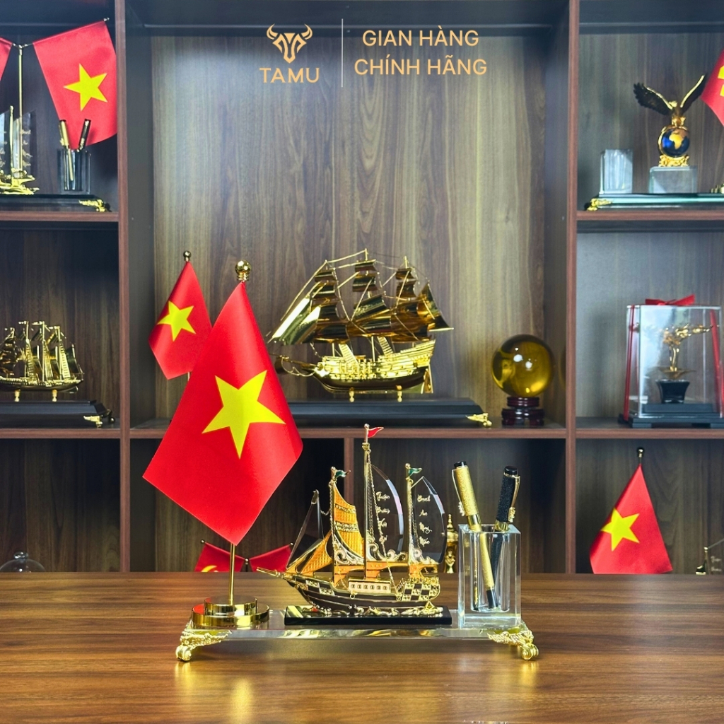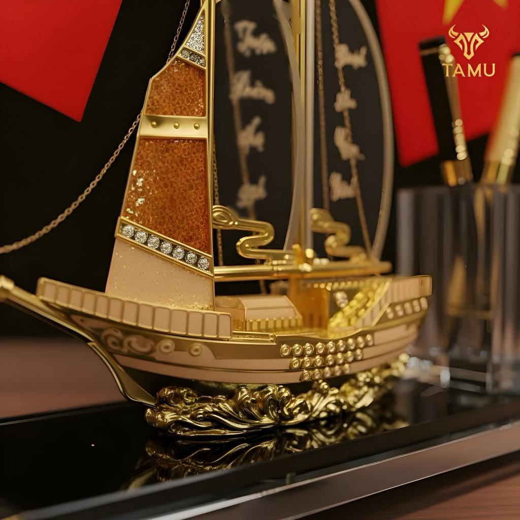 Hộp Cắm Bút Doanh Nhân TAMU Thuận Buồm Xuôi Gió Đồng Mạ Vàng 24K - Pha Lê K9 – Quà Lưu Niệm Trang Trí Tặng Kèm Hộp Quà